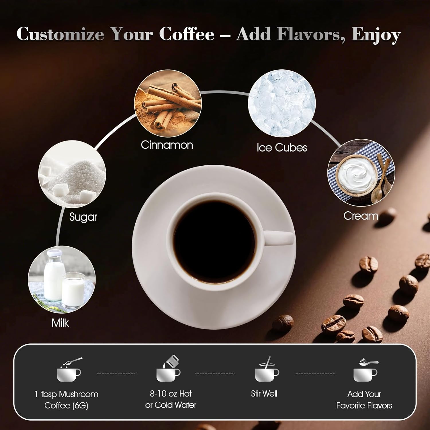 Customize Your Perfect Cup: Enjoy your way—add your favorite milk, creamer, or sweetener. Mix one tablespoon (6g) with 8–10 oz of water. A bit of sediment is natural and a sign of clean, real ingredients. Stir well and sip your personalized mushroom-powered brew.