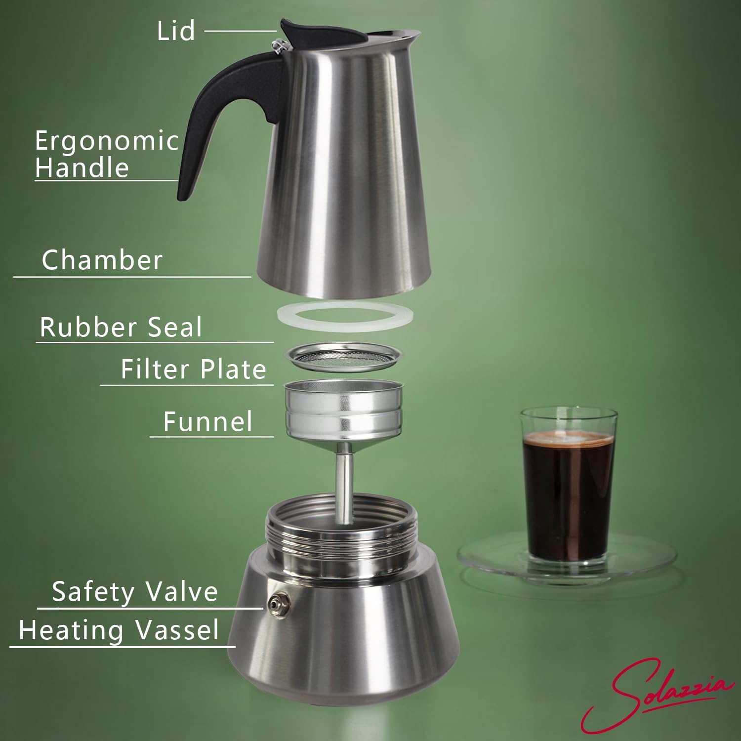 Material: Our 12 Cup Moka Pot features a matte stainless steel body, offering a refined and modern look that suits any occasion. It is equipped with a high-performance, pressure-resistant safety valve design to effectively prevent overpressure. This durable stainless steel coffee maker is always ready to brew a great cup of coffee.
