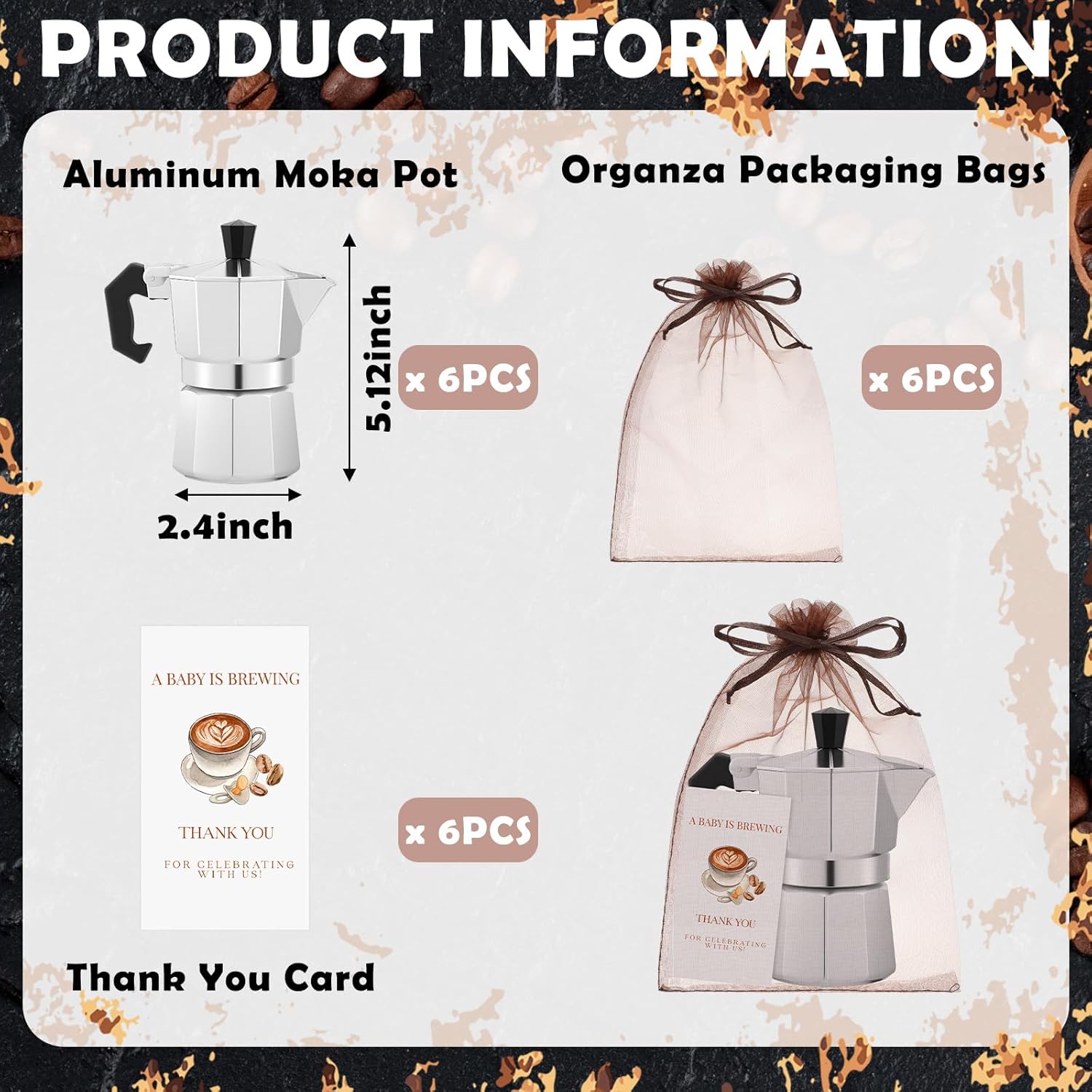 Suitable Baby Shower Party Favors: this delightful set includes 6 50ml mini Moka pots with sacks and cards, creating complete and charming baby shower party favors for your guests