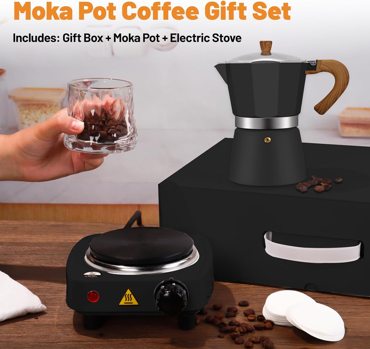 Portable Gift Box Set: This 2-in-1 coffee set with moka pot and electric ceramic stove brings you a professional-grade espresso experience. Plug and play design, no need for complicated installation, power on to heat up quickly, suitable for all kinds of moka pots such as aluminum and stainless steel. Compact and integrated design, easy to operate without taking up space, can be easily used at home or office, so that you can experience café-level flavor at any time