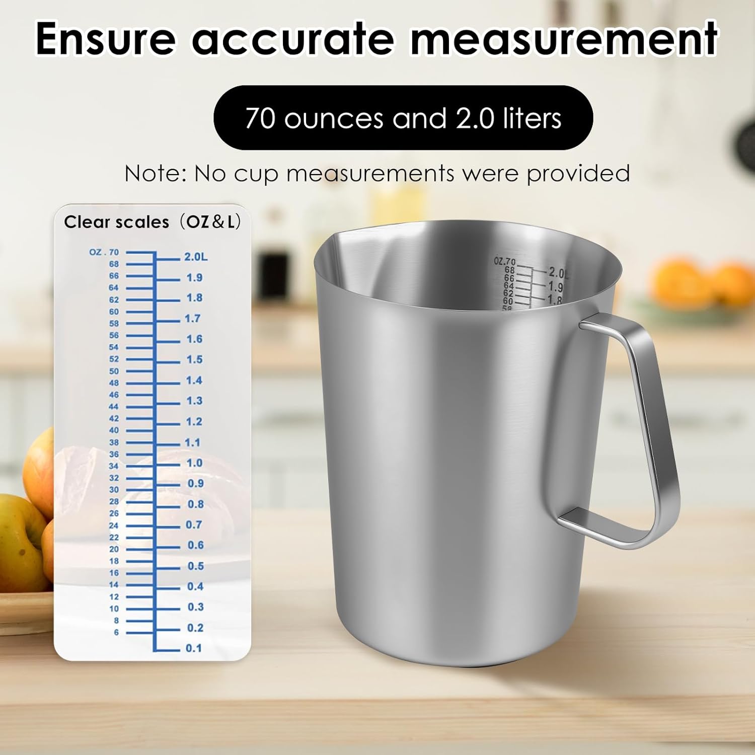 [ Precise Markings] Our Metal Measuring Cup use ounce (0-70 ounces) and liter (0-2.0 liters) scales for precise measurements, with step sizes of 2 ounces and 0.1 liters, and clear scales to ensure accurate measurements are taken. Note: No cup measurements were provided.