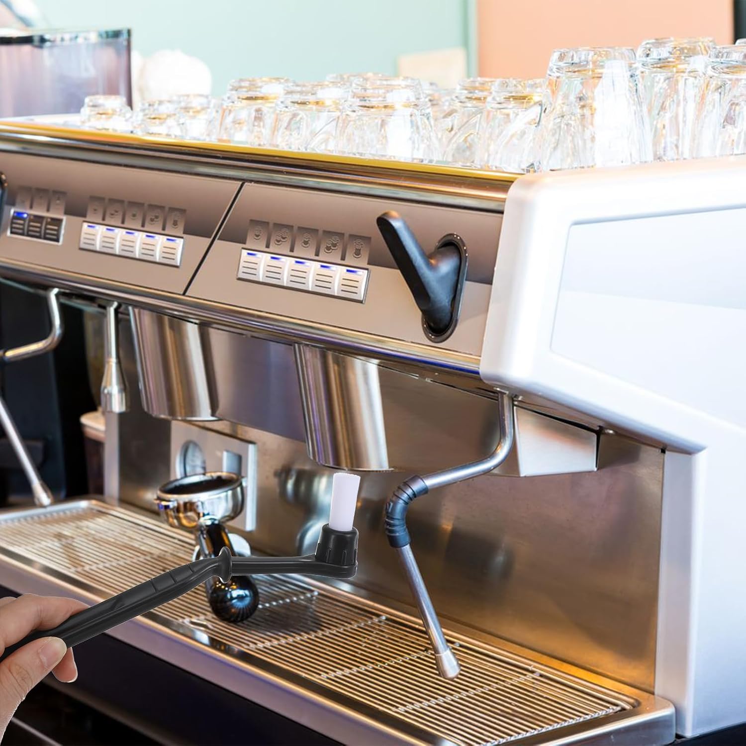 Espresso Machine Cleaning Brush: The espresso machine cleaning brush features a unique design with water-deflecting fins, keeping your hands cool and dry during the cleaning process