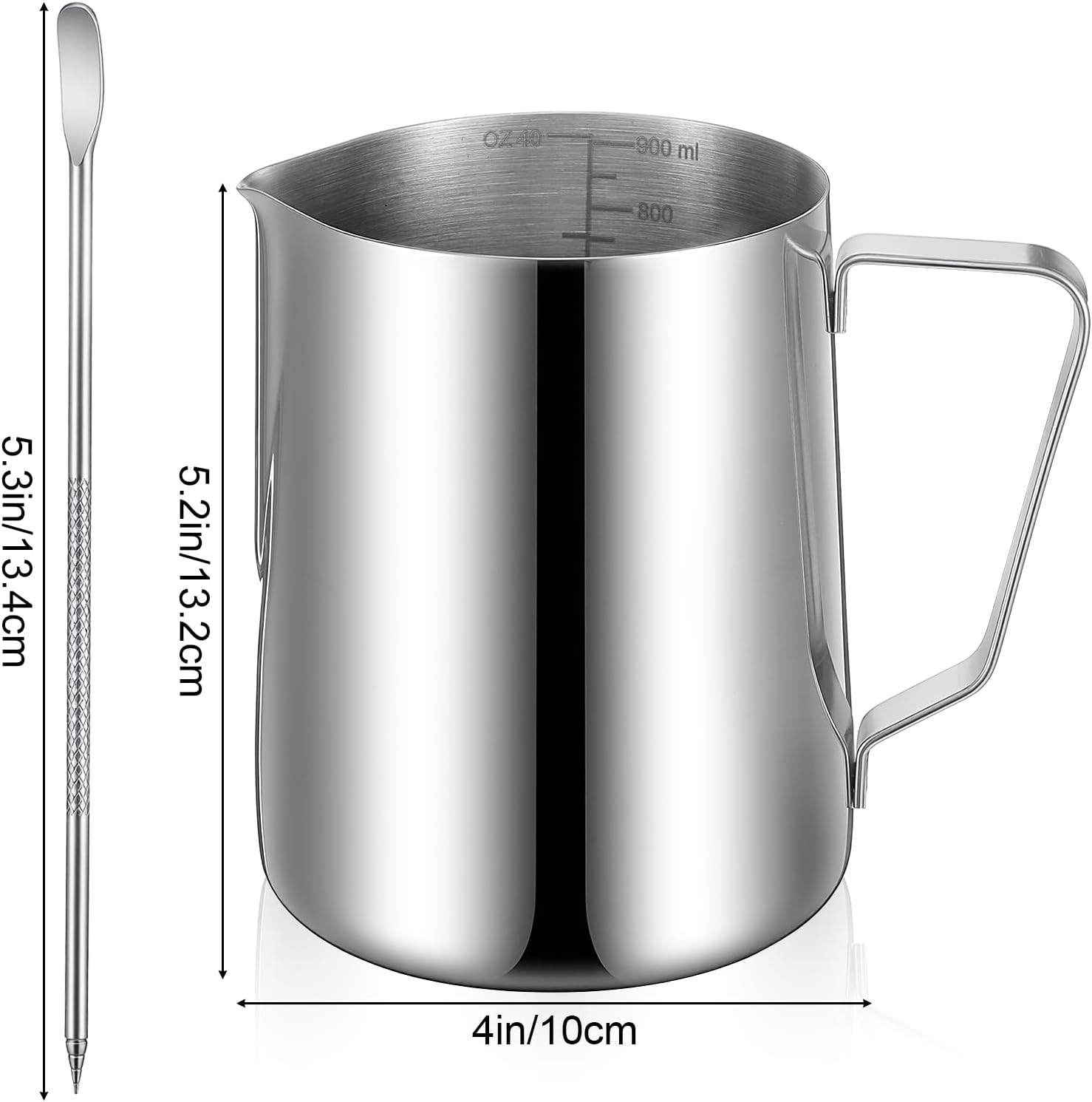Hygienic & Resilient Build: Crafted from solid 304 stainless steel, this milk steaming pitcher resists coffee and milk stains, odors, and thermal shock. Its seamless interior and rounded bottom make rinsing quick and thorough, ensuring a clean start for every session, which is essential for both daily home use and demanding professional milk frothing pitcher environments