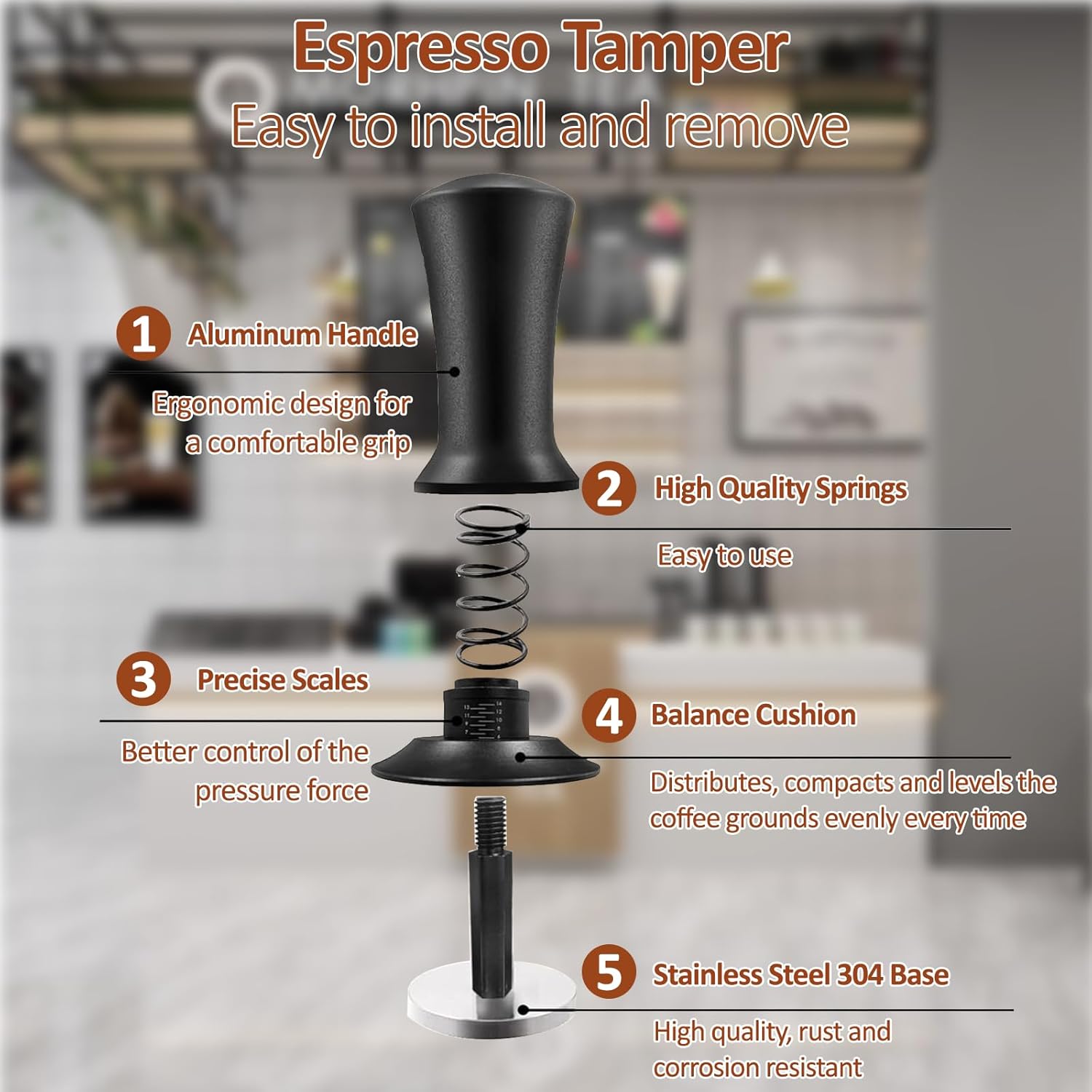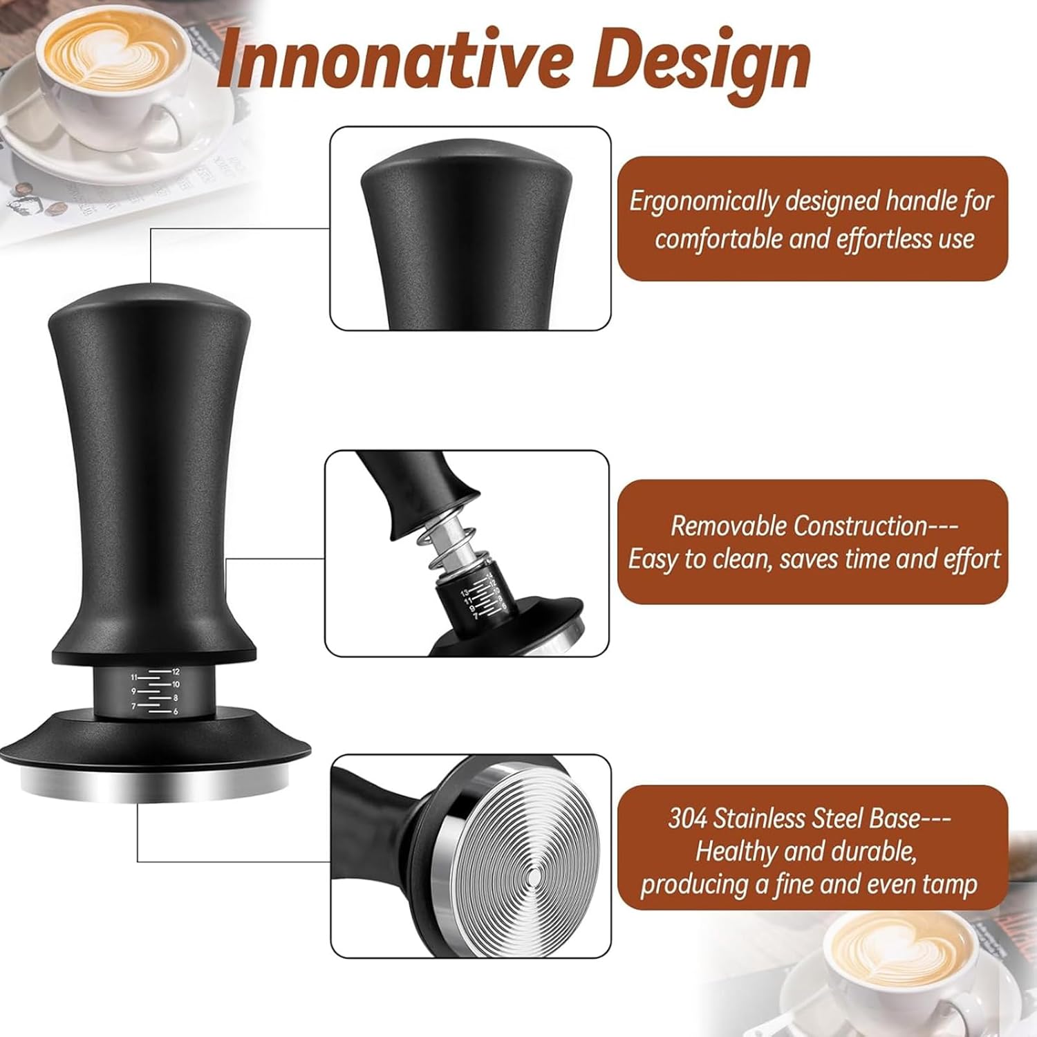 PRECISION COFFEE TAMPER: The ergonomic tamper features clear measurement markings for accurate pressure control, ensuring consistent results with every espresso or coffee brew