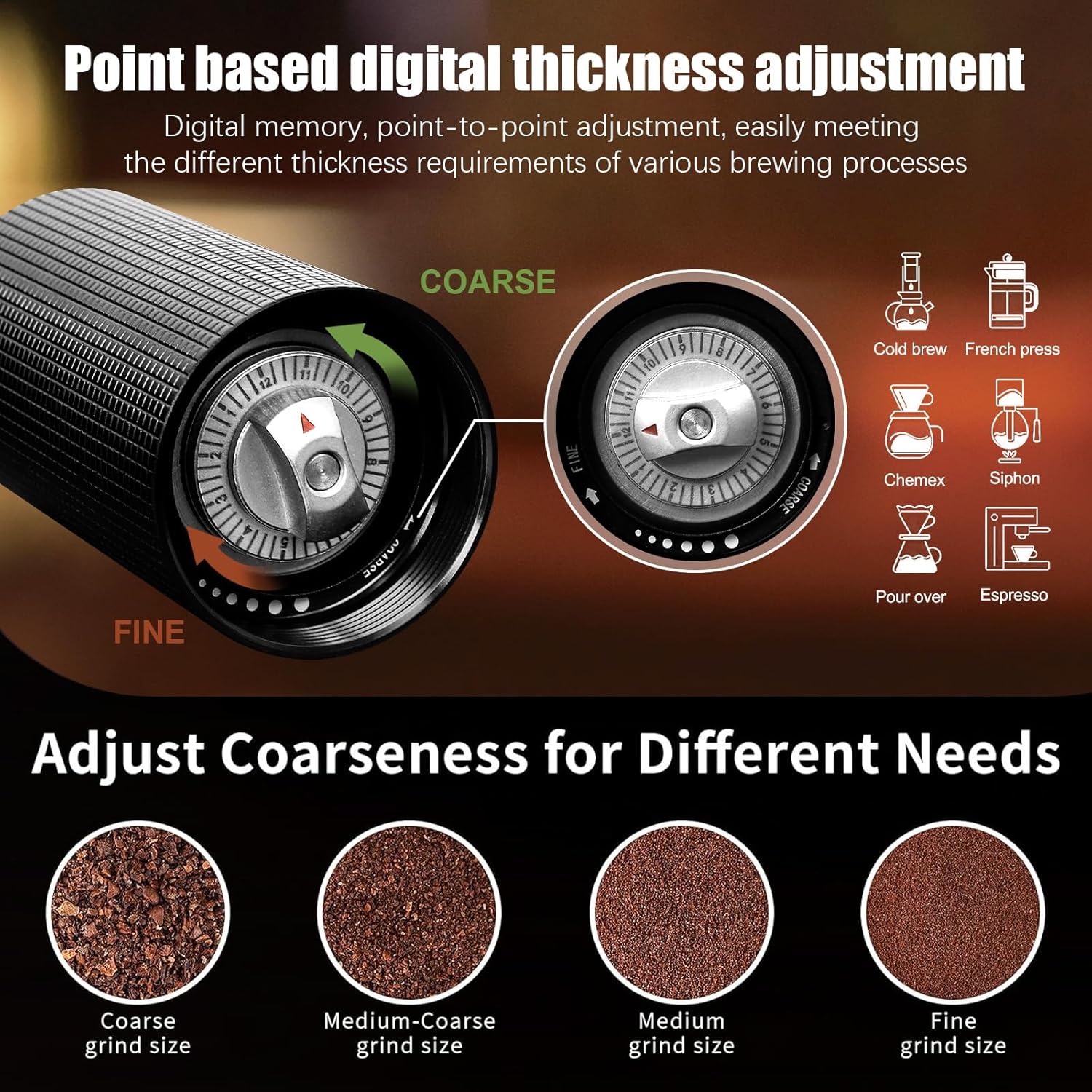 Roughness Adjustment Function: With digital memory and point-to-point adjustment, it can easily meet the different coarseness and fineness requirements of various brewing, clockwise rotation, finer powder; counterclockwise rotation, coarser powder. Achieve the ideal grind for French press coffee, espresso or any of your favorite brews