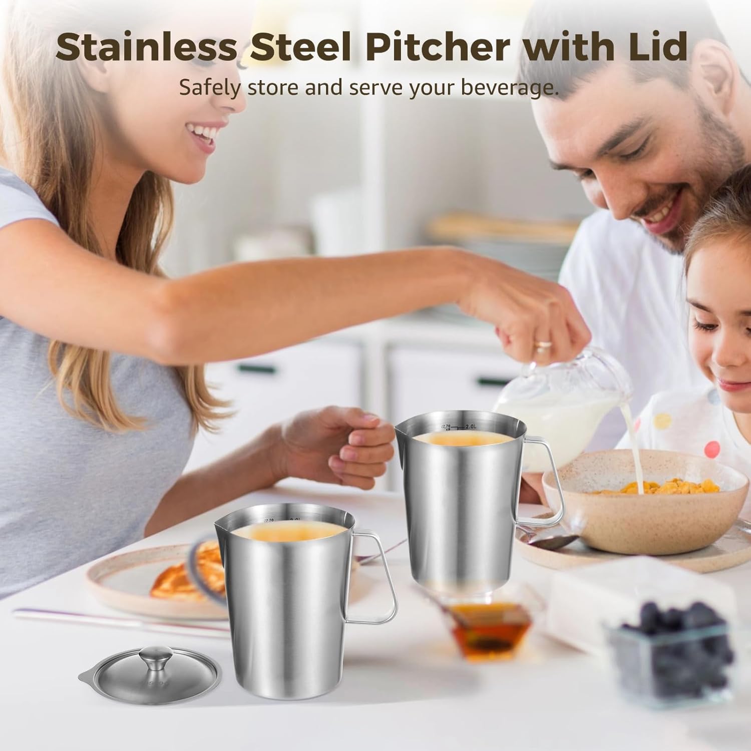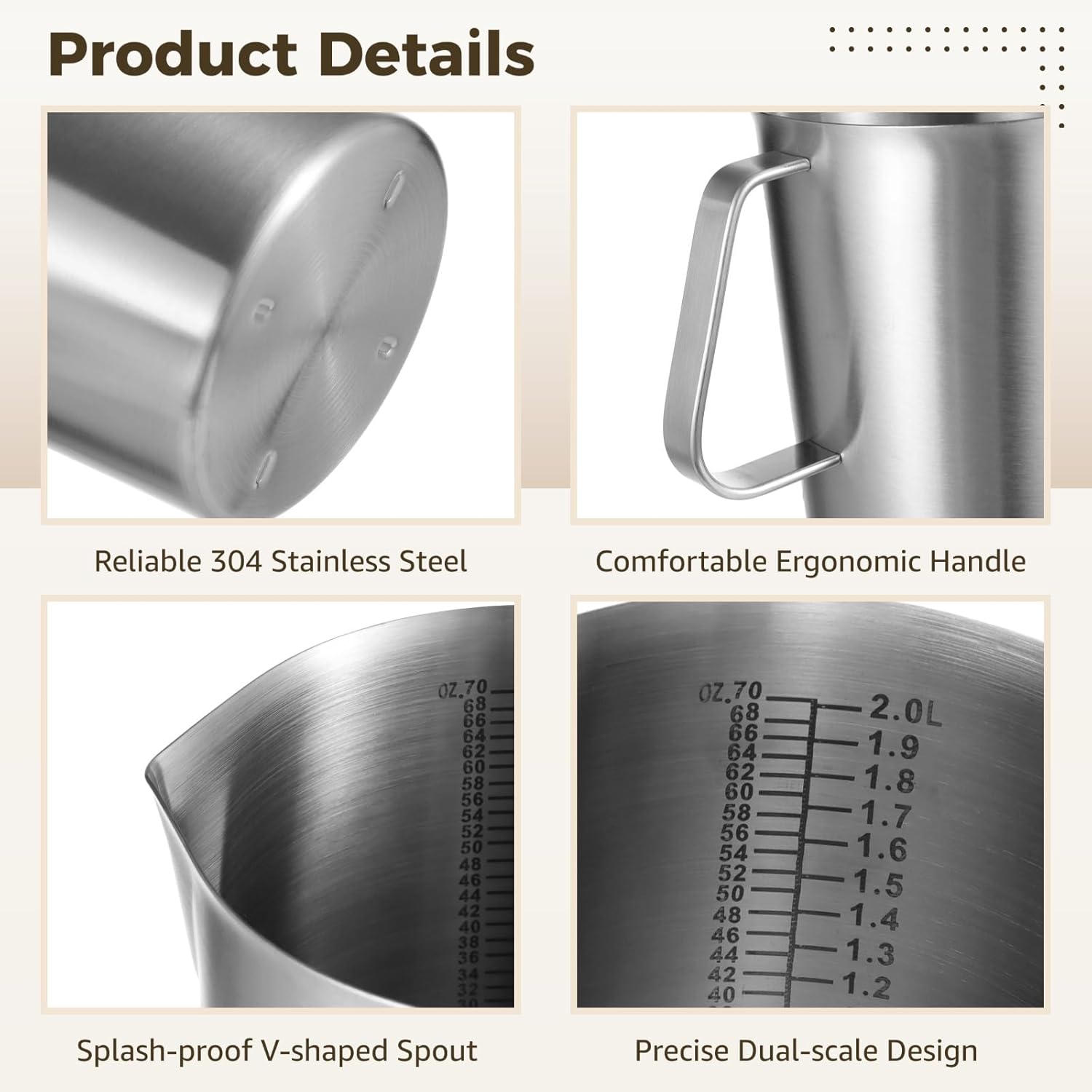 2L Stainless Steel Pitcher with Lid, 70 oz Measuring Cup with Dual-Scale Markings, Milk Frothing Jug, Large Beaker for Espresso Machine, Hot/Cold Water, Latte Art, Iced Tea