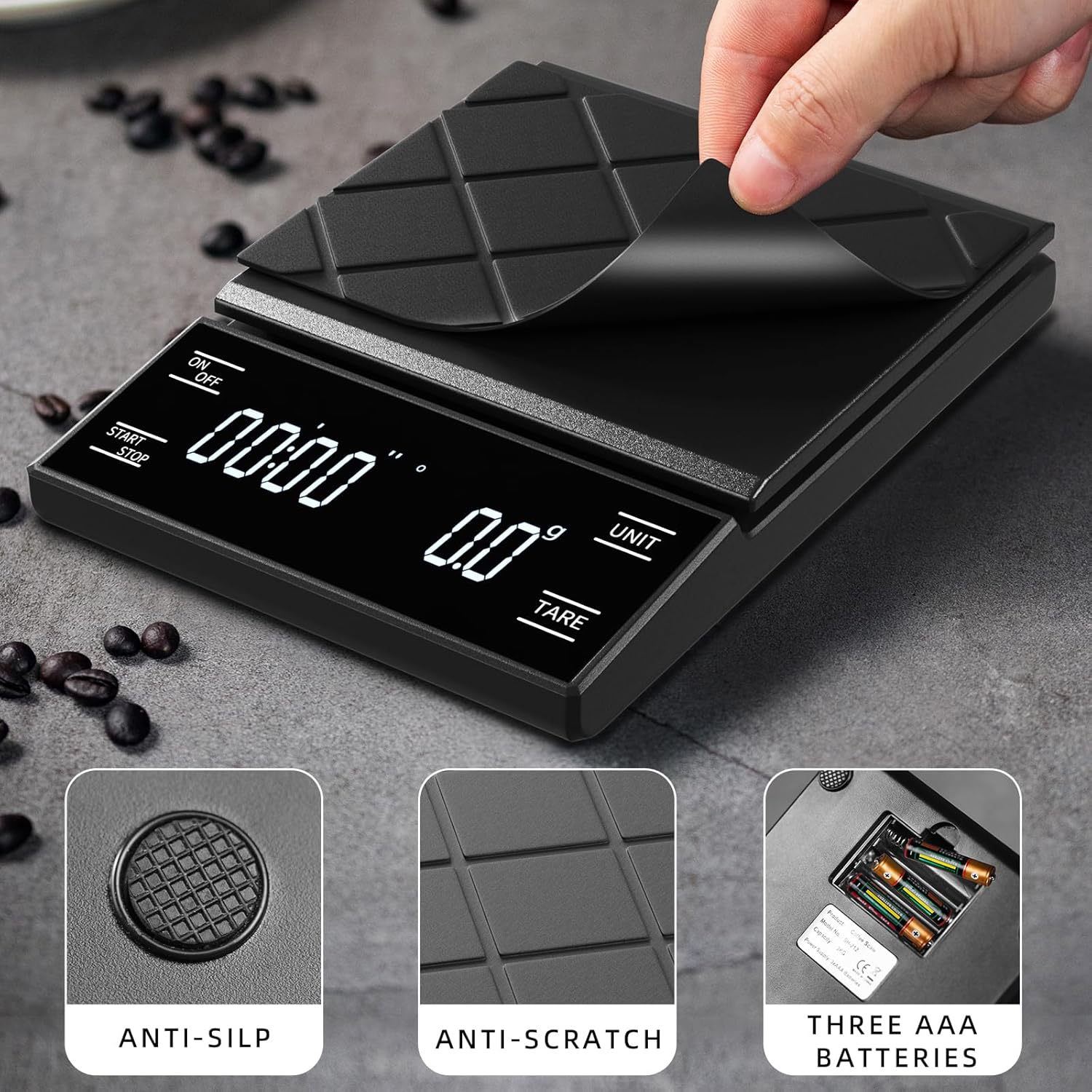 SUPERIOR QUALITY MATERIALS: digital coffee scale with a high-quality ABS platform and frame, this digital kitchen scale is durable and easy to clean and maintenance.It is non-slip and scratch-resistant,with removable silicone pads to protect the surface