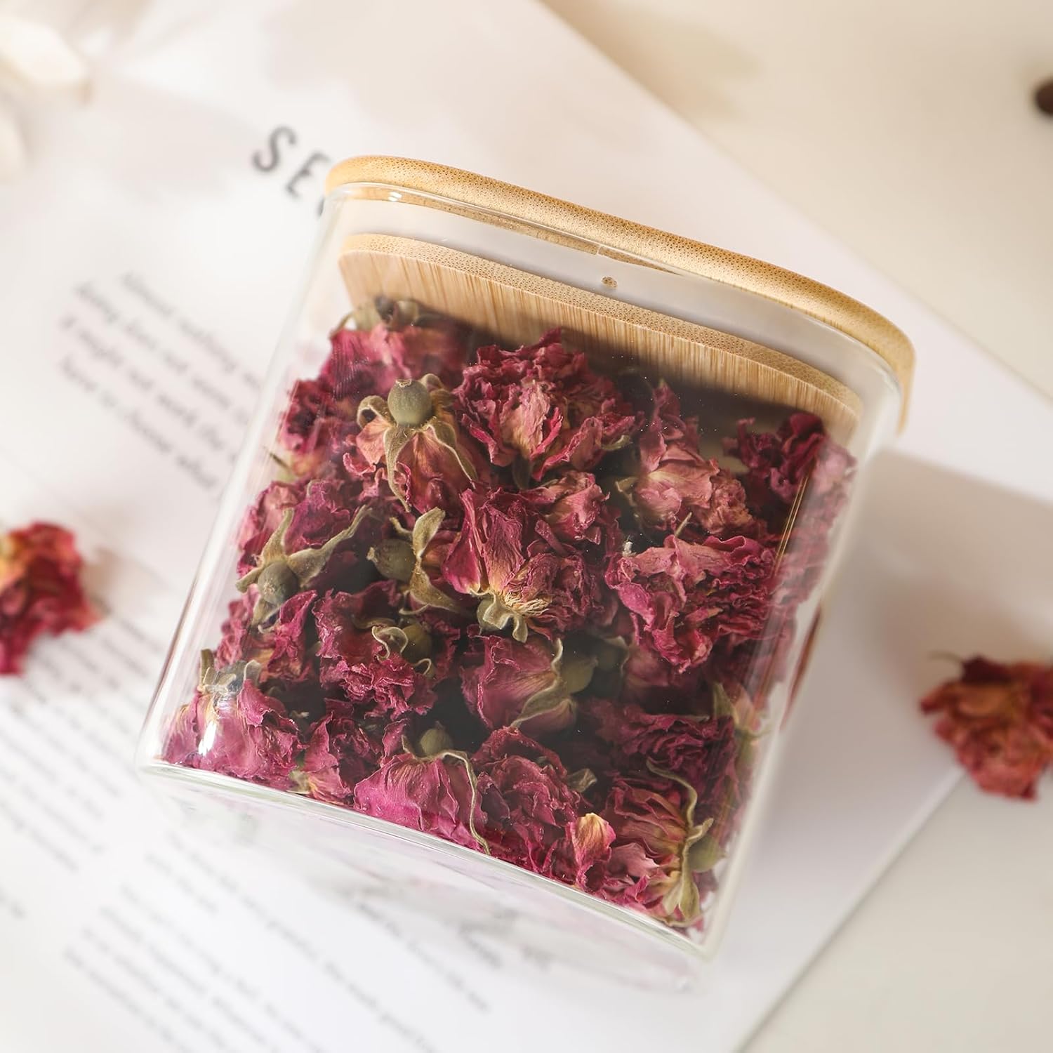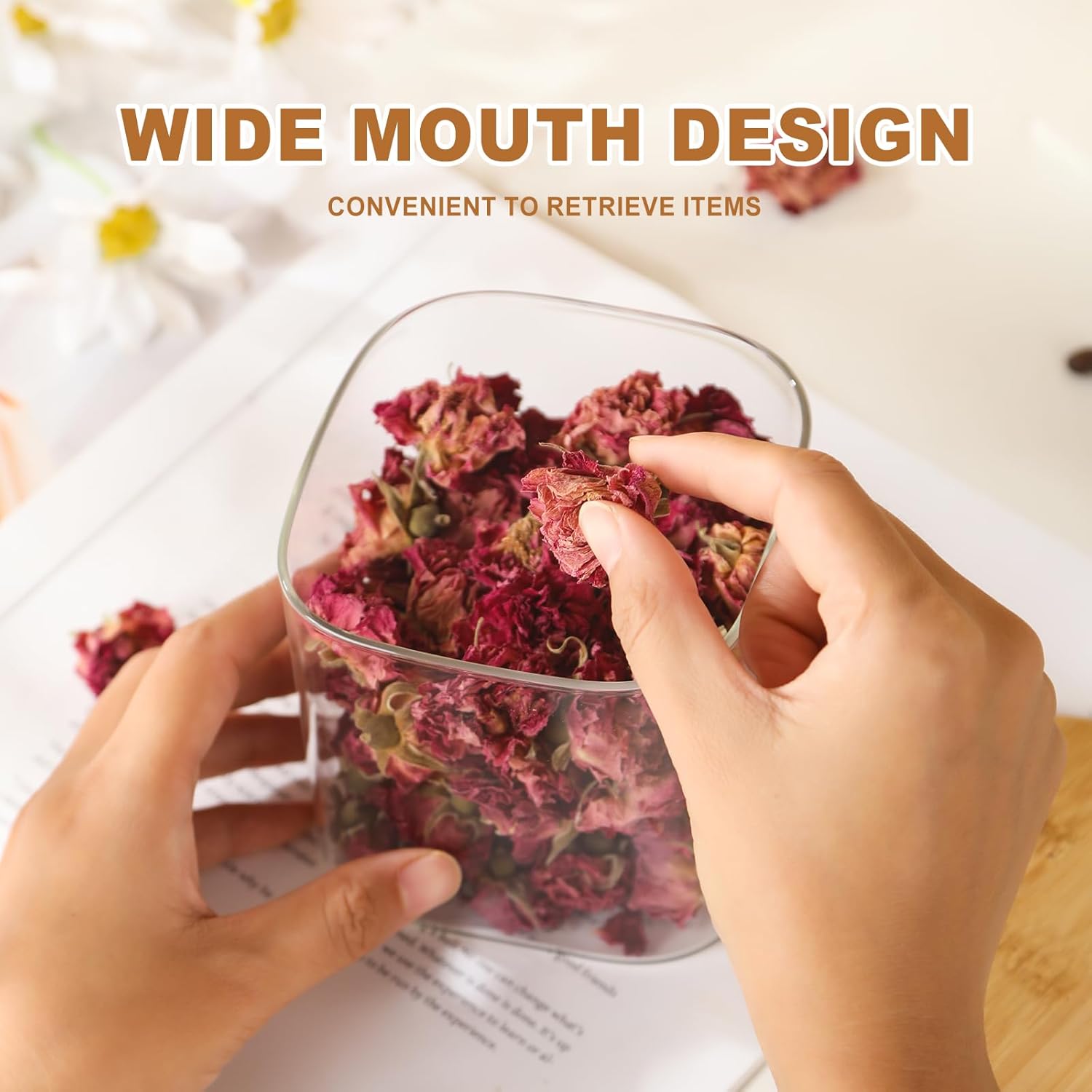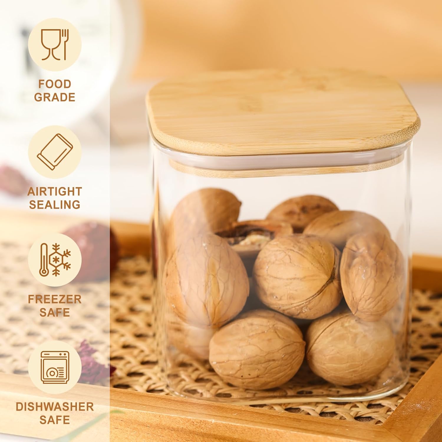 【Durable and Easy to Clean】Glass jars with bamboo lids.Glass jars can be washed by hand or in the dishwasher, and the maintenance is very convenient