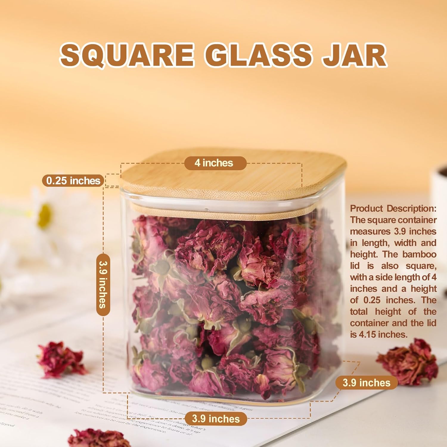 【Small Food Storage Container】 4-piece set with a nominal capacity of 0.2 US gallons per unit. The container is a square, wide-mouth jar measuring 3.9 inches in length, width, and height; wall thickness is 0.1 inch. The bamboo lid measures 4.0 inches in side length and 0.25 inch in height. When assembled, the total height of the jar with lid is 4.15 inches.