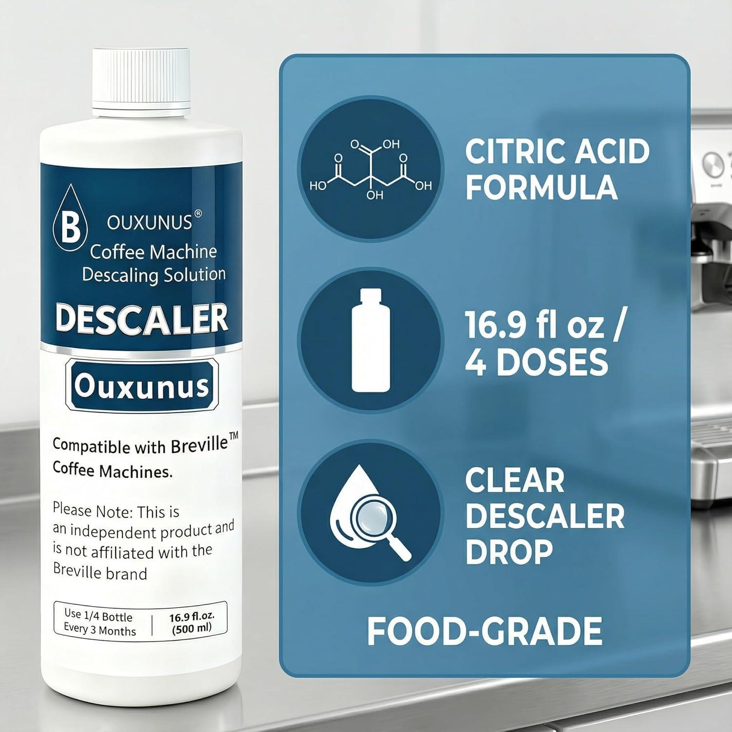 4-Use Lemon Acid Descaling Solution: 16.9 fl oz (500ml) lemon acid solution provides 4 complete descaling cycles (using 4.2 fl oz/125ml per application). Gently dissolves scale and mineral deposits to maintain optimal machine performance