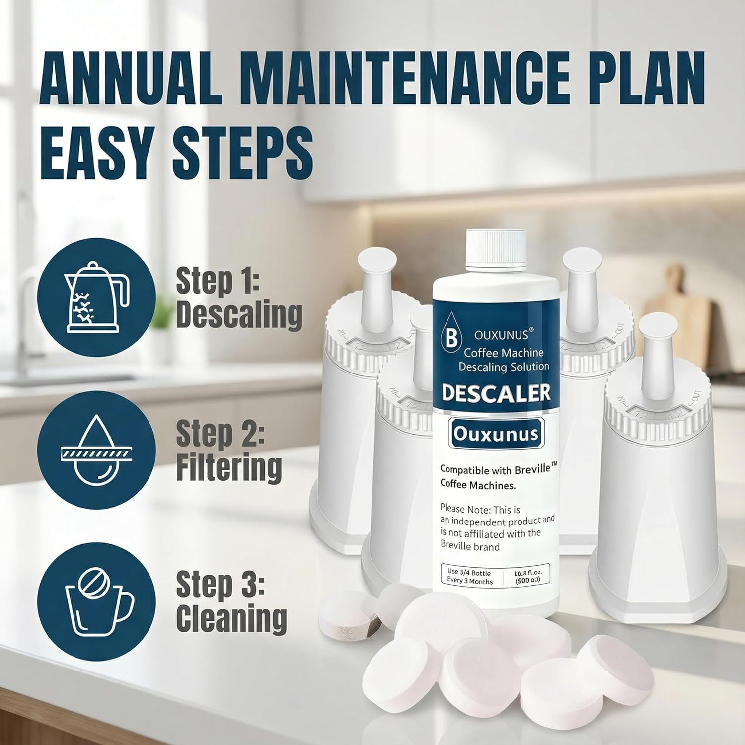 Convenient Maintenance Schedule: With 4 filters (monthly replacement) and 4-use descaling solution, this kit offers a smart maintenance routine. Ideal for quarterly descaling in normal water conditions or more frequent use in hard water areas