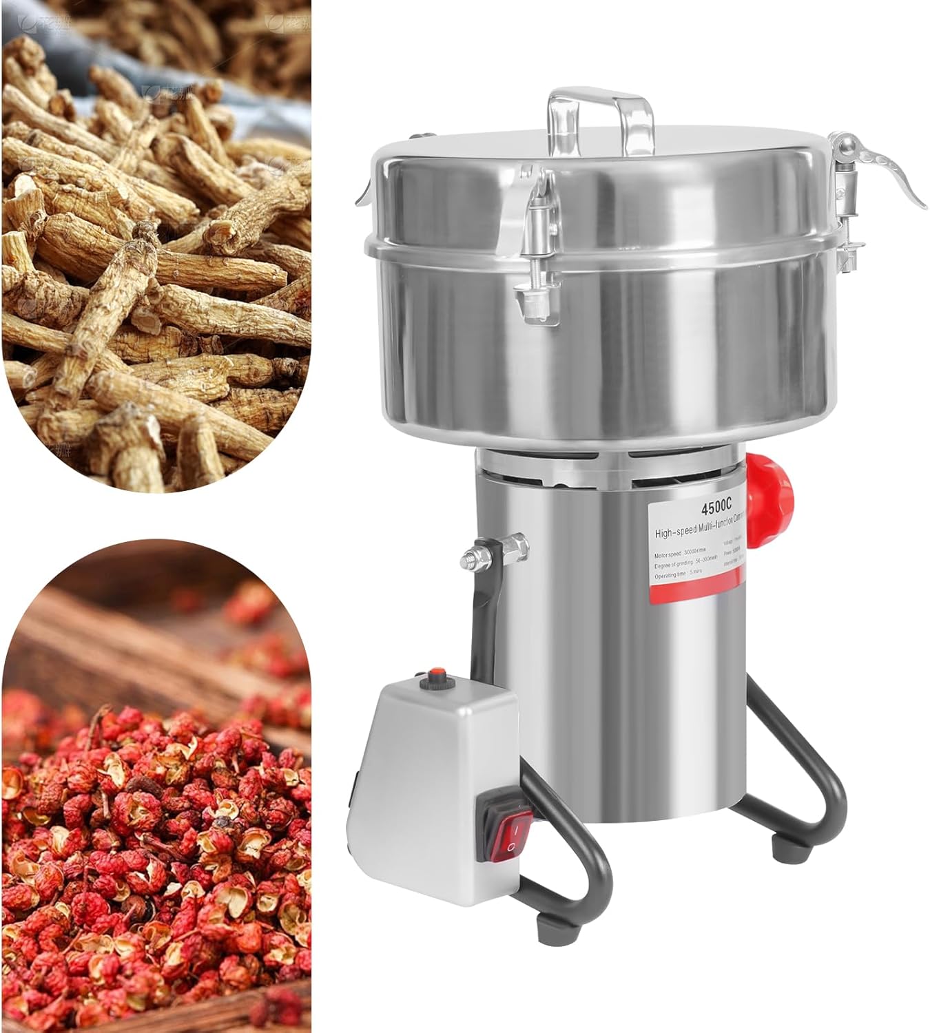 It can be used for grinding grains and cereals (peanuts, sesame, walnuts, red beans, soybeans, mung beans, rice, millet, corn, etc.), seasonings (star anise, cinnamon, allspice, peppercorns, chilies, grass nuts, fennel, cloves, rock sugar, etc.); Chinese herbs (Sanqi, Tianma, Ginseng, Maca, Lingzhi, Huangqi, Poria cocos, Haima, Turtle Shell, etc.); and others (shrimp skins, pig’s livers, coffee beans, fodder, bait, dog food, etc.).