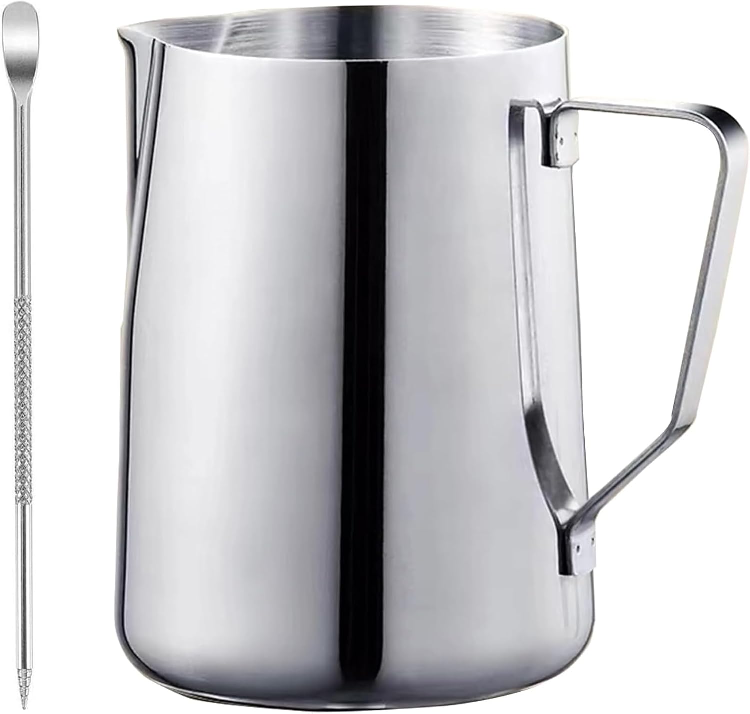 ☕【Fashion & Durable】The milk frothing pitcher is made of high quality 304 stainless steel, strong and durable, exquisite workmanship.non-rust,anti-corrosion,unbreakable for daily use. Very easy to clean after use.