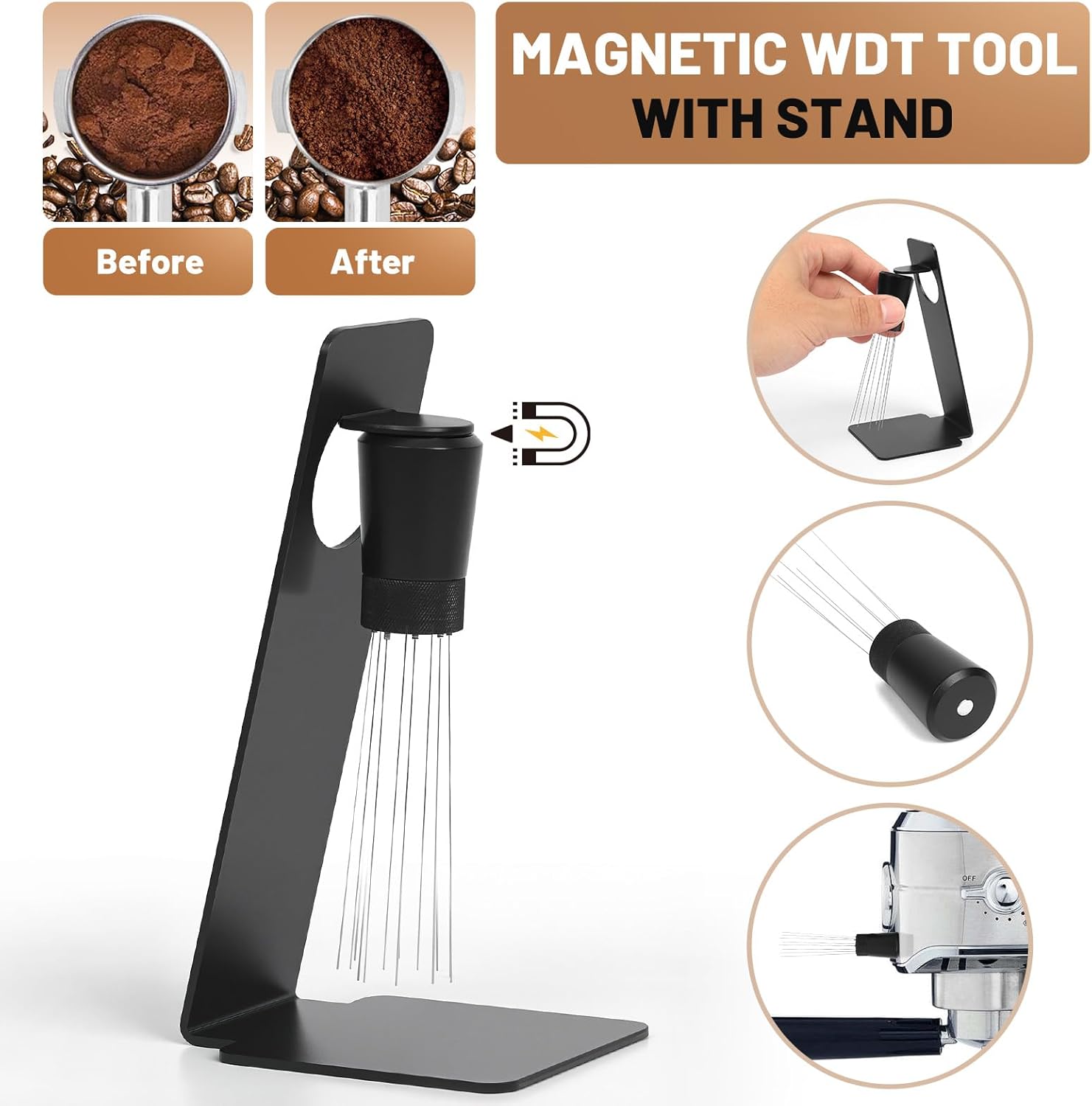 Espresso Coffee Stirrer – The handle of this espresso needle stirrer is crafted from aluminum alloy and includes 8 needles, each 0.35mm in diameter. It effortlessly breaks up coffee clumps and allows for easy disassembly and adjustment of the needle count and length. The built-in magnetic bead at the top of the handle ensures secure attachment to the matching iron bracket and makes it easy to pick up