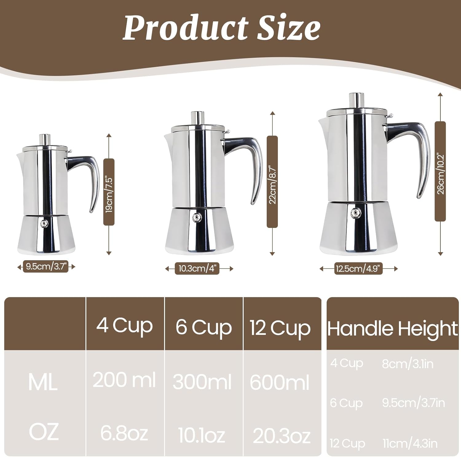 3 Capacities to Choose: Considering the different usage scenarios of the moka pot, we offer you 3 different capacities to choose from:4cup 200ml/6 cup 300 ml/12 cup 600 ml. Warm reminder, the capacity here refers to the amount of water added to the Pot , not the extracted coffee capacity,1cup=50ml.