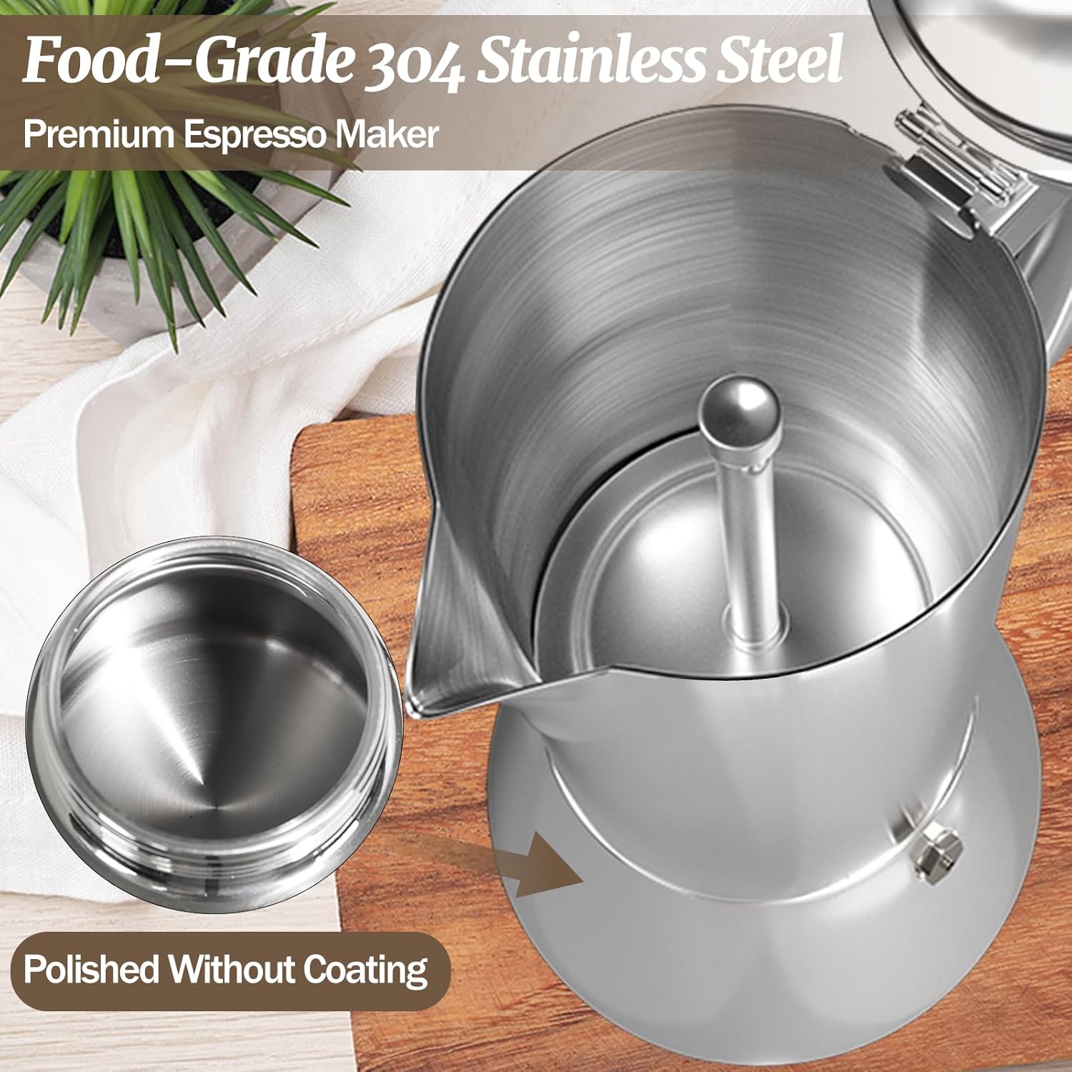 Trustworthy: Stainless steel moka pot is induction safe and very strong and durable. Crafted with semi-handmade craftsmanship, every detail is carefully polished for superior quality.
