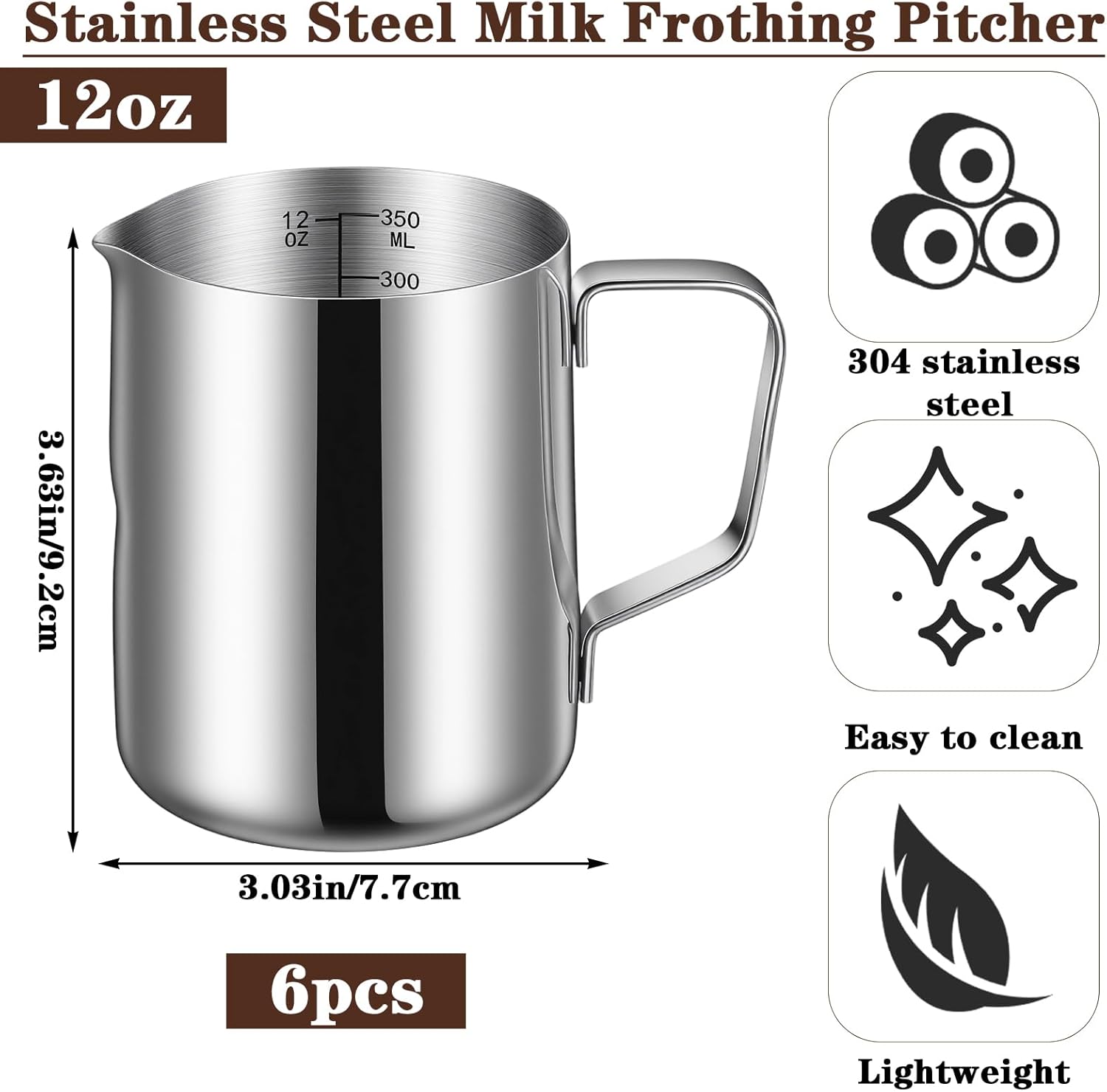 Each 12 oz milk frother cup is made from 304 stainless steel and features a built-in scale for accuracy. The compact milk steaming pitcher design ensures easy handling and storage. Perfect for crafting latte art, cappuccinos, and more, this milk pitcher is a versatile tool for any coffee lover. The set of 6 steaming pitchers meets diverse frothing needs efficiently.
