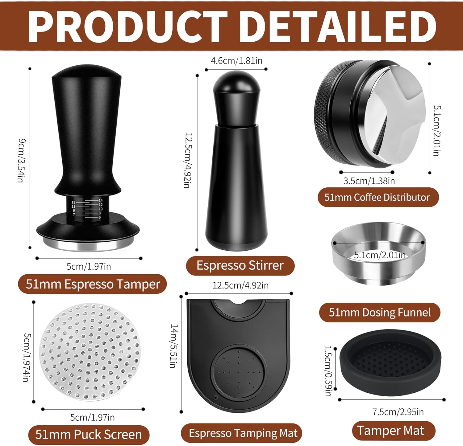 【51mm Espresso Accessories Kit】- 7pcs professional espresso accessories tools set, packaging includes 1 *51mm espresso tamper, 1*coffee distributor,1*espresso puck screen, 1*51mm dosing funnel,1*tamper Mat, 1*espresso stirrer, 1*espresso tamping mat
