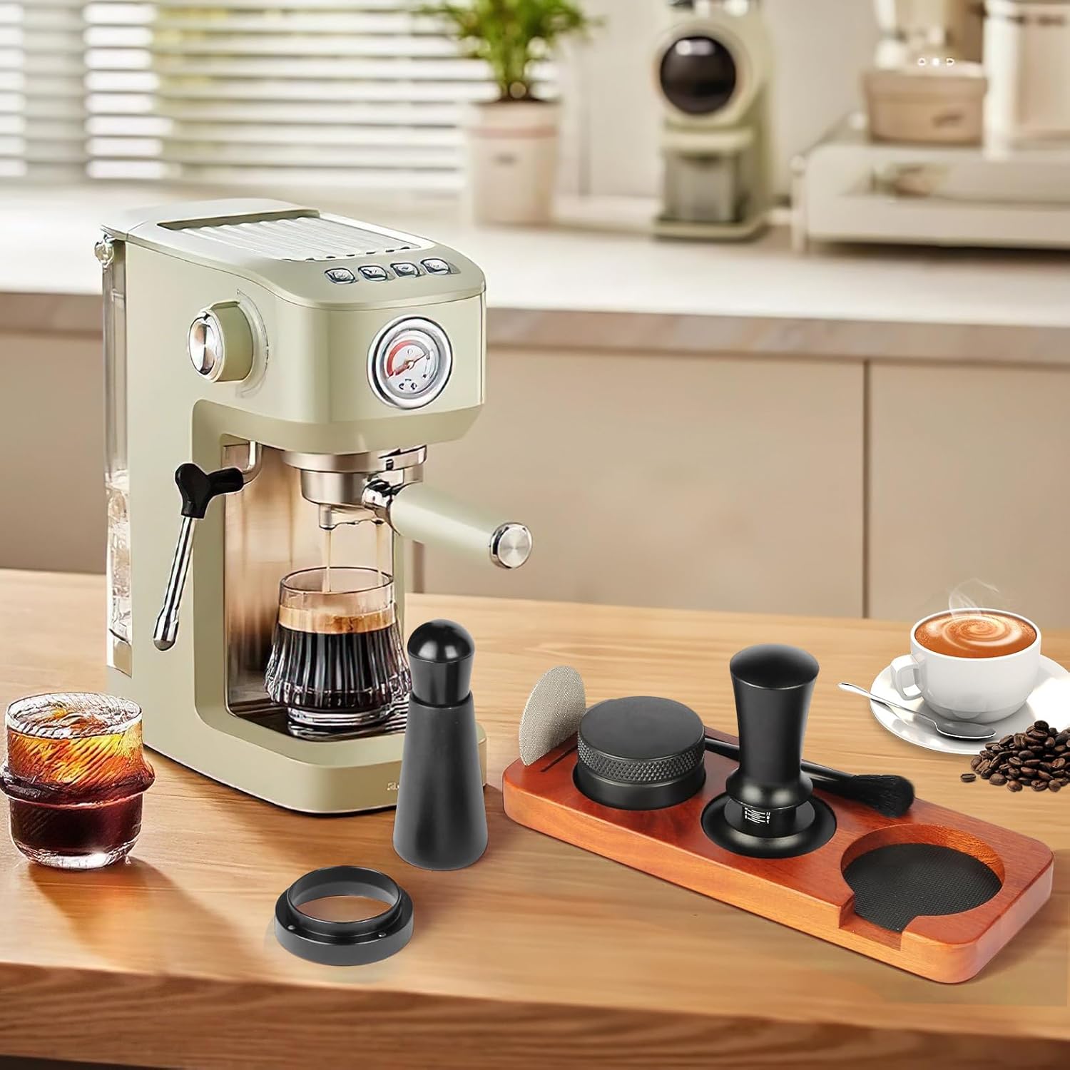 Package Includes: 54mm espresso tamper, coffee needle stirrer, wooden espresso tamping station, dosing funnel, double-headed cleaning brush, puck screen and coffee distributor to meet your needs at one time