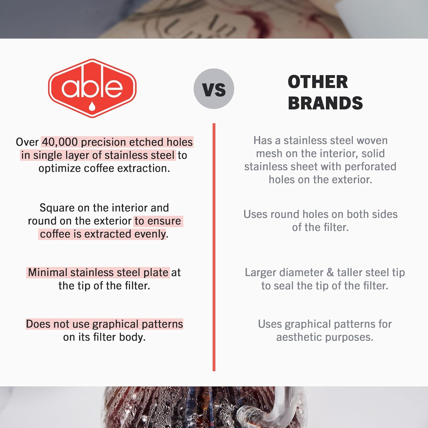 BUILT TO LAST – Constructed from a single piece of precision welded, photo-chemically etched stainless steel and an injection-molded, food-safe polymer support ring, the Kone is built to stand up to the daily demands of the cafe.