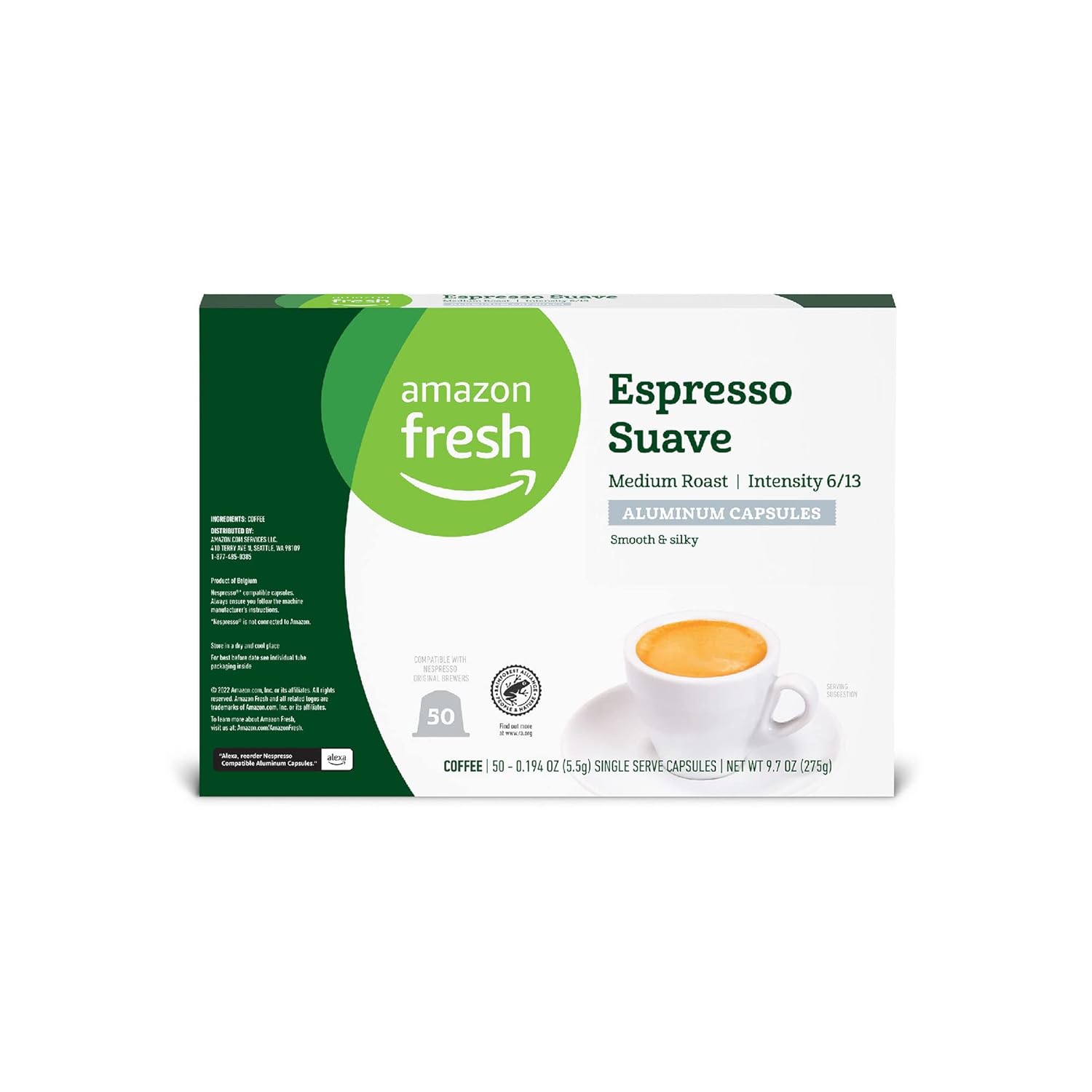 Amazon Fresh Espresso Suave Medium Roast Aluminum Capsules, Compatible with Nespresso Original Brewers, Intensity 6/13, 50 Count (5 Packs of 10), FLAVOR: Smooth & silky, 50 SINGLE SERVE ALUMINUM CAPSULES: Compatible with Nespresso original brewers