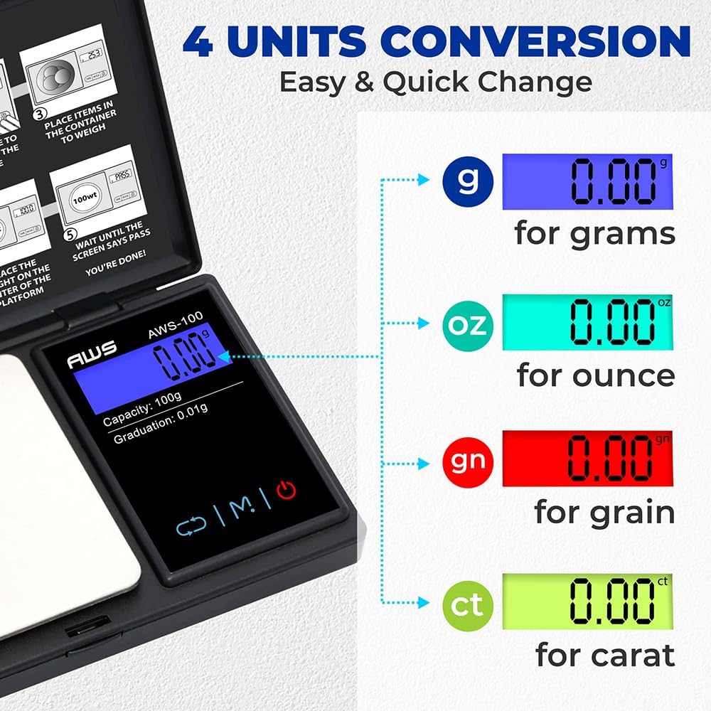 High Precision and Accuracy: The AWS-600 digital pocket scale equipped with high precision sensors, this sensors offer accuracy with precision weight readings. this weight gram scales offers 0.01g accuracy and a 100 gram of capacity, ideal for food, jewelry, coins,medicine, supplements and powders.