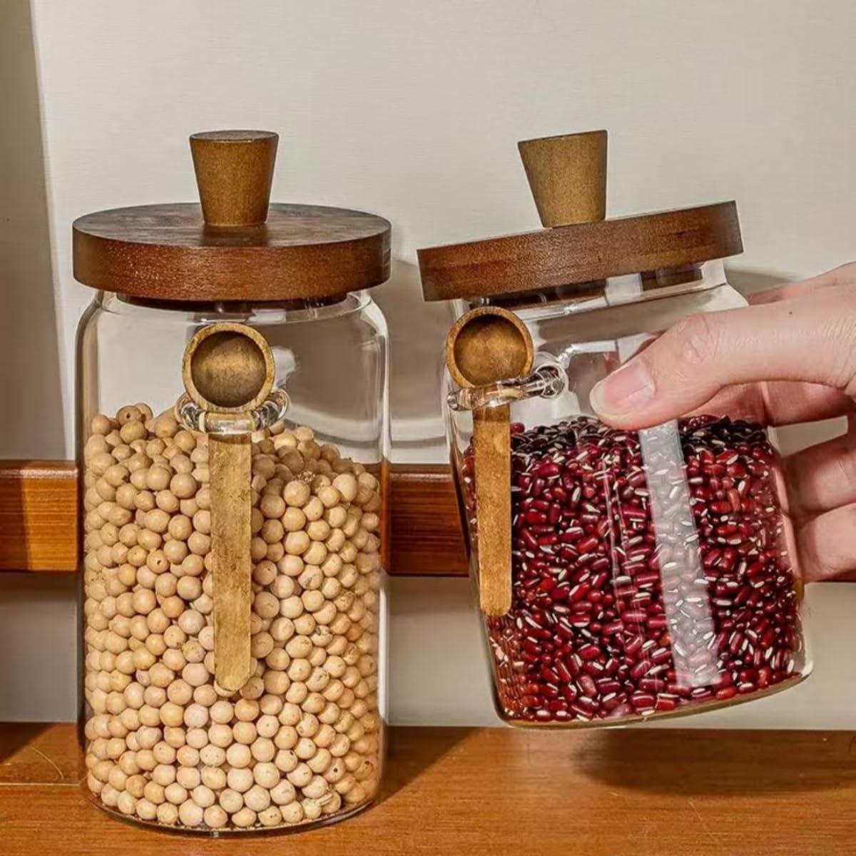 Ergonomic & User-Friendly Design – Each glass jar with wooden lid features an easy-grip curved shape and a handy bamboo spoon that clips securely inside. The wood handle ensures effortless opening, making daily use in the kitchen or coffee station smooth and convenient