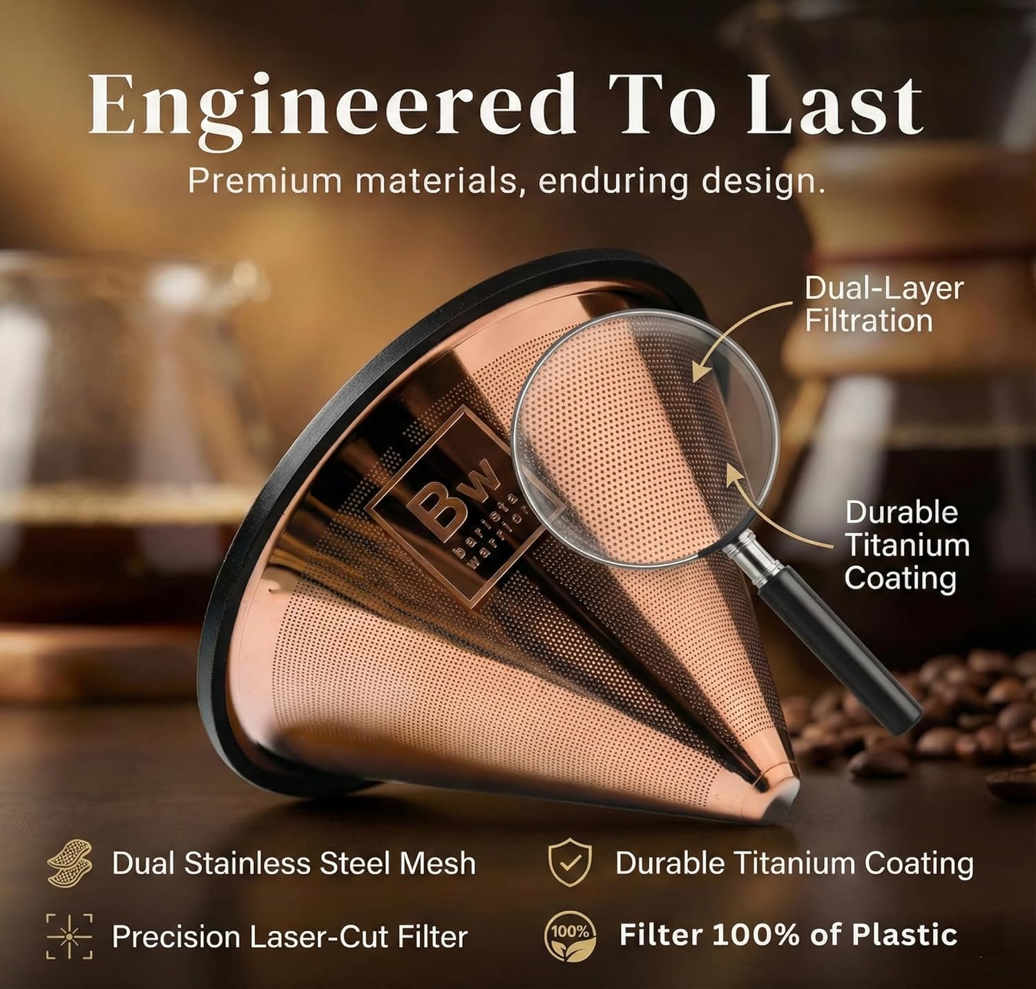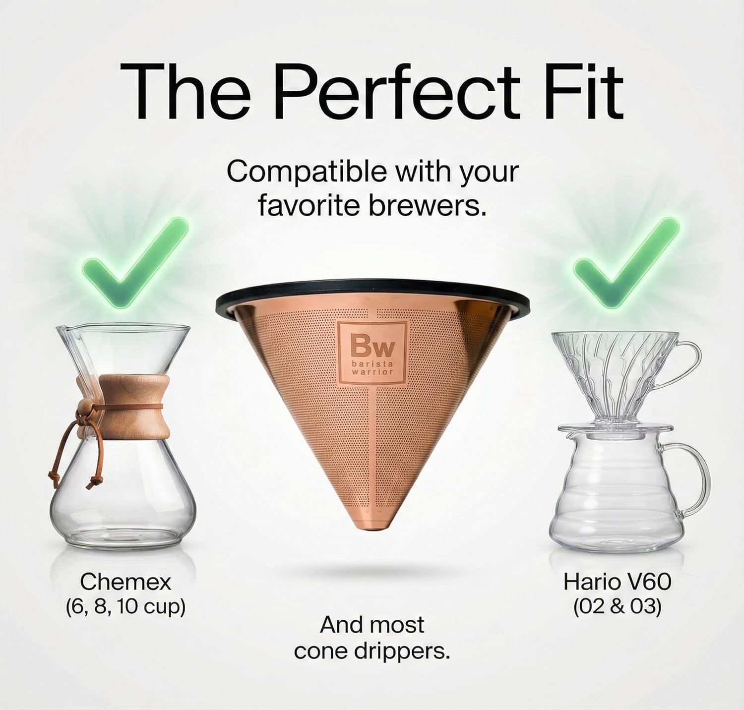 Barista Warrior Compatible for Chemex, Hario V60 & popular coffee makers, Pour Over Coffee Filters- Reusable and Permanent Coffee Cone Dripper (Copper Coated)