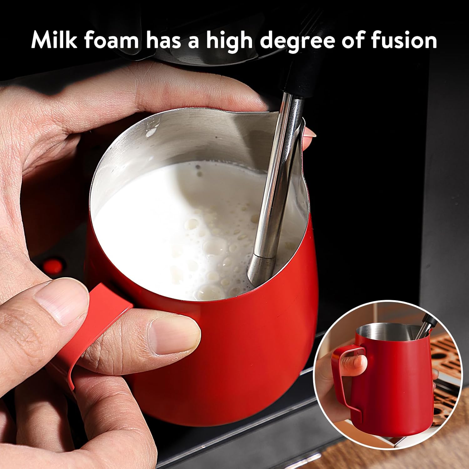 Double Arc Spout for Precision Control:Features an innovative double arc spout design that promotes smoother milk vortexing and more uniform foam integration. Enables effortless, precise pouring and controlled wiggling for creating clear, detailed patterns like rosettas and tulips.