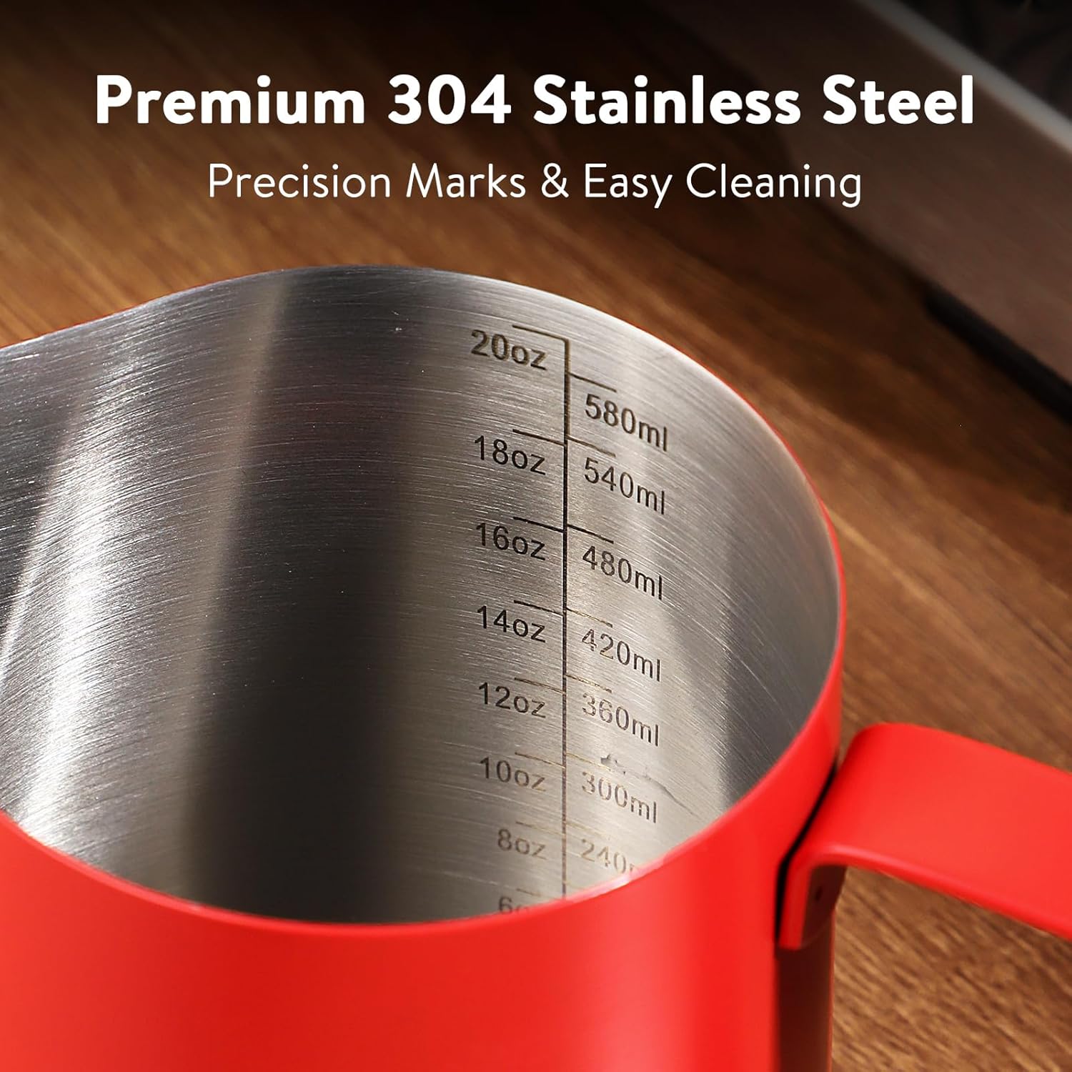 Internal Measurement Marks & Two Sizes:Equipped with clear interior measurement lines (350ml/12oz and 600ml/20oz options) for precise milk portioning. Achieve the perfect milk-to-espresso ratio consistently, eliminating guesswork and waste.