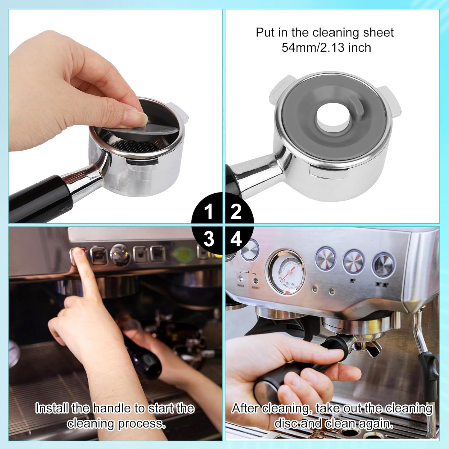 Product Size: The size of our espresso cleaning disc measures about 54mm/2.13 inch. Please confirm whether the size is suitable before placing an order.