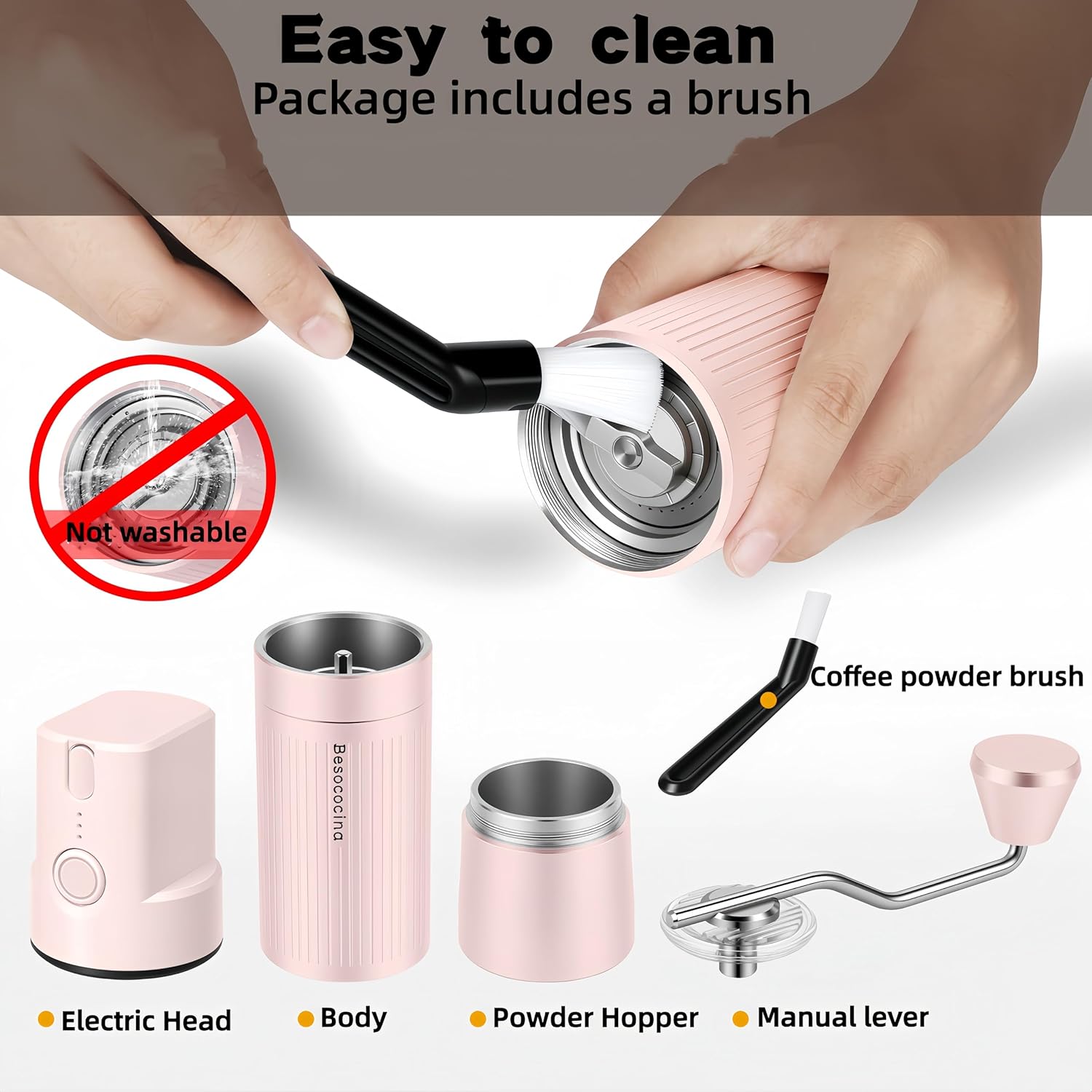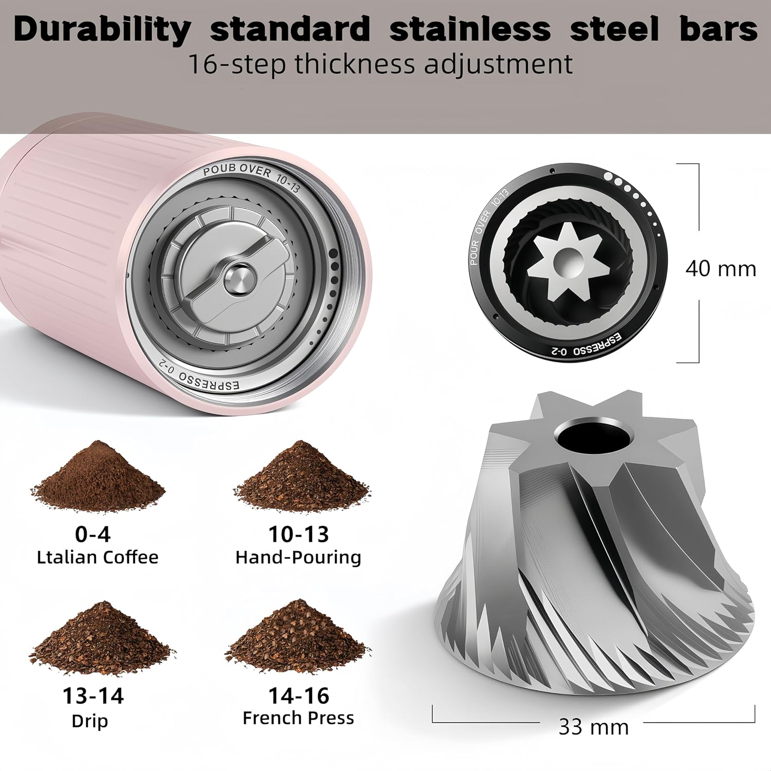 Burr Coffee Grinder 2-in-1 Manual/Electric, 40mm Stainless Steel Conical Burr Coffee Bean Grinder, USB Rechargeable Home Use, 16 Grind Levels for Espresso/Drip/French Press/Mocha (Pink)