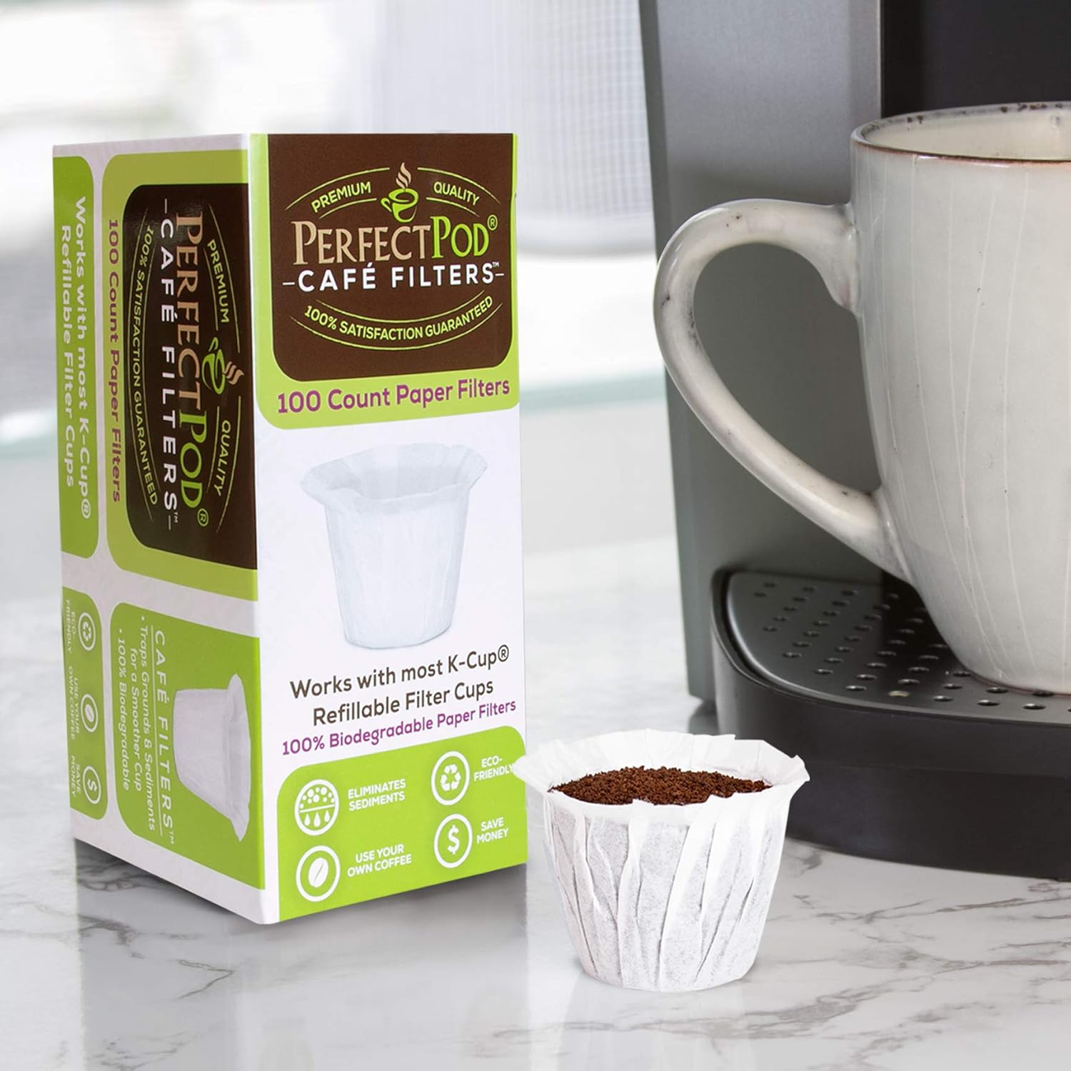 Use your favorite coffee and save up to 80% over the cost of pre-filled single-serve coffee pod capsules. Additional paper filters sold separately. Cafe-Filter Cups by Perfect Pod’s disposable paper coffee filters (for use with virtually any other reusable K-Cup; sold separately) allow for a cleaner, smoother cup of coffee with less sediment and coffee oils.