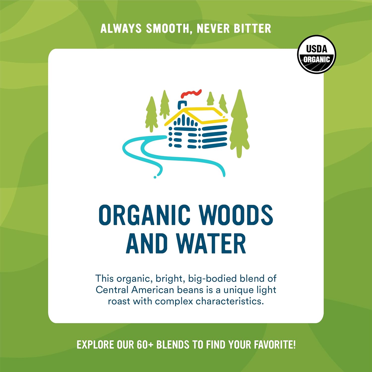 100% USDA Certified Organic Arabica coffee beans expertly roasted for a smooth, never bitter taste