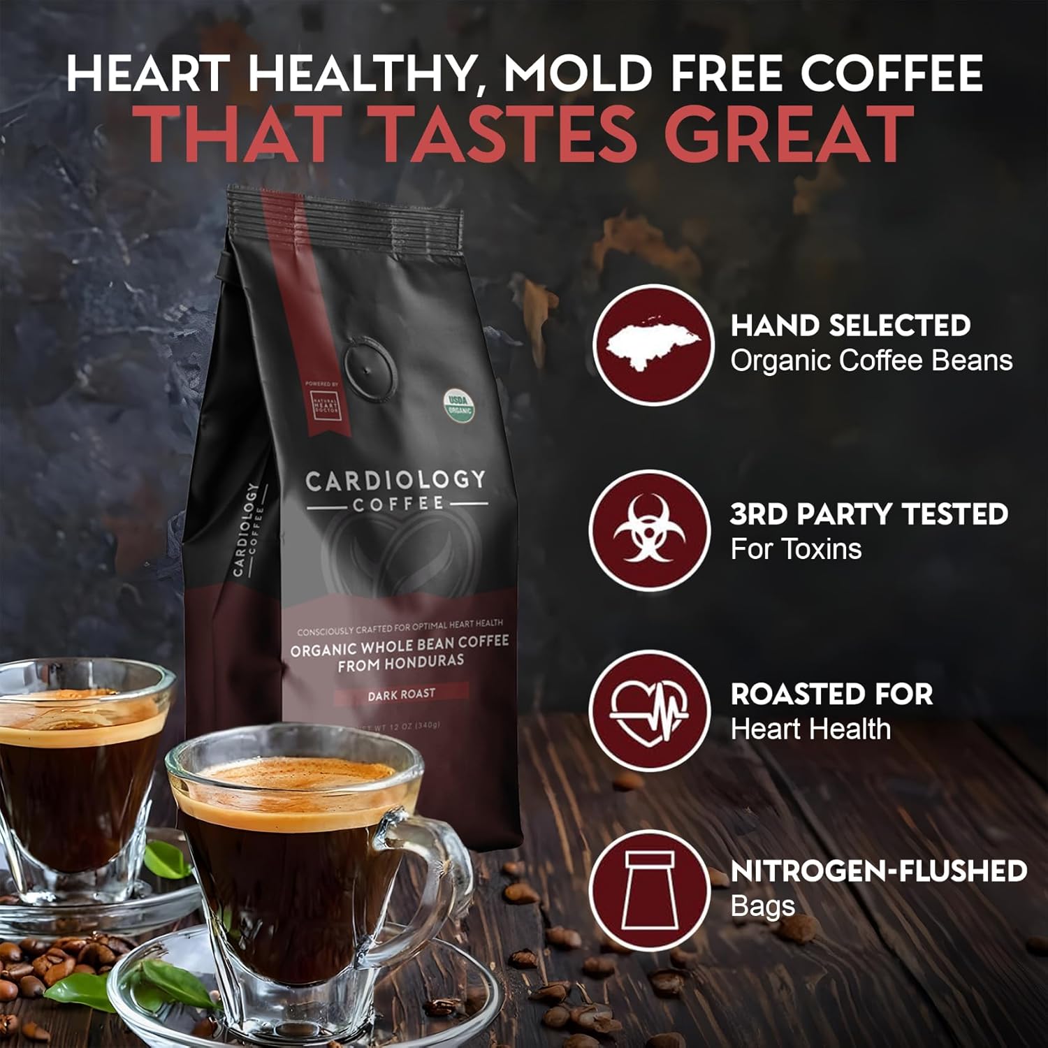 Cardiology Coffee – Whole Bean Coffee – USDA Certified Organic, Mold Free 12oz Premium Dark Roast Coffee Beans – Organic Espresso Beans with Antioxidant Benefits – Perfect for Heart Healthy Lifestyle