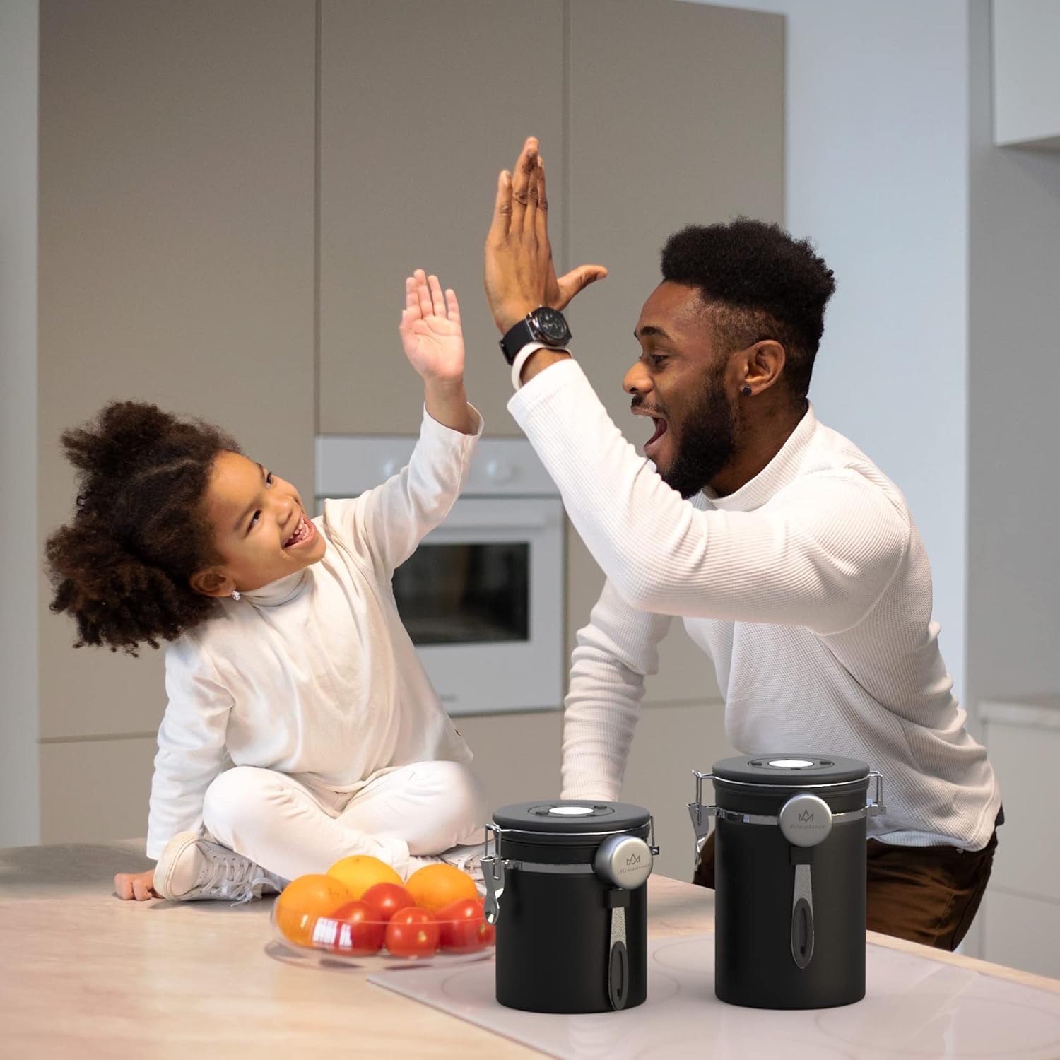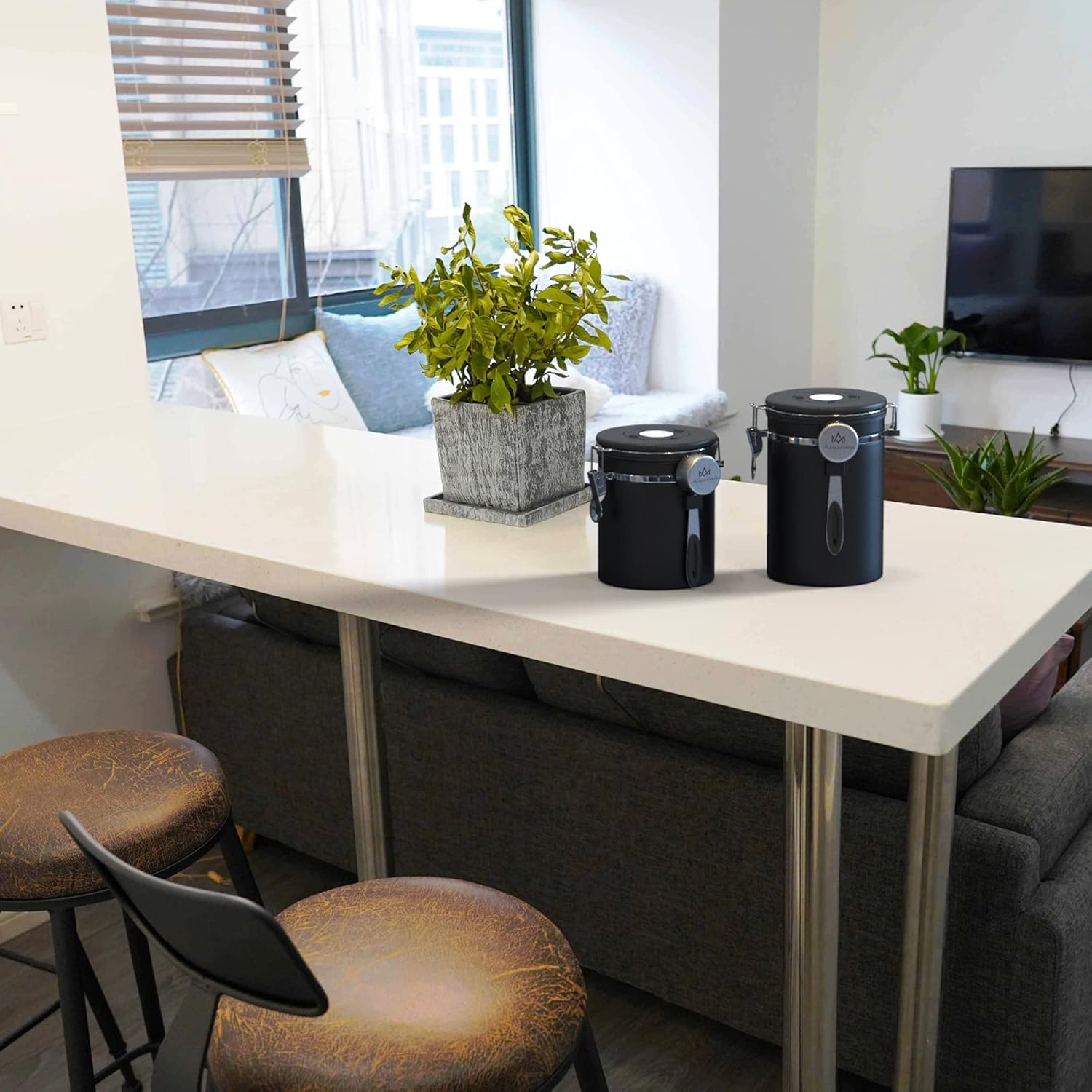 Coffee canister for ground coffee with Scoop Date Tracker One Way Co2 Valve 304 Stainless Steel Kitchen Food Airtight storage container for Coffee Beans,Grounds,Tea,Sugar (Black, 16oz)