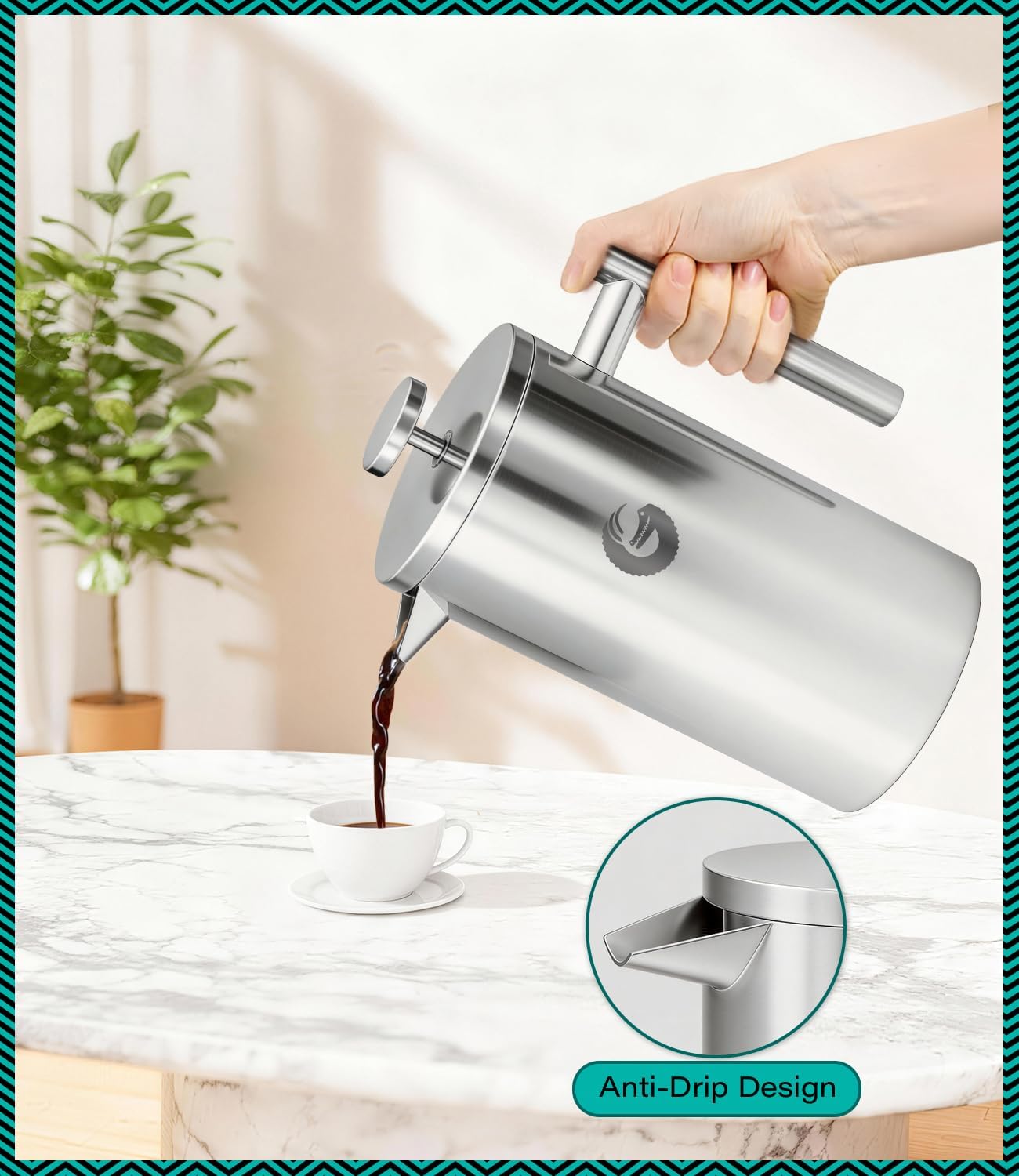 Coffee Gator 304 Grade Stainless Steel French Press Coffee Maker 34 oz, Double Wall Insulated Teapot with 4-Level Filtration System, Include Travel Jar Canister, Rust-Free, Dishwasher Safe, Silver