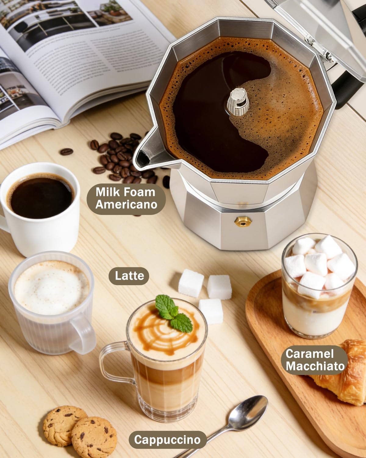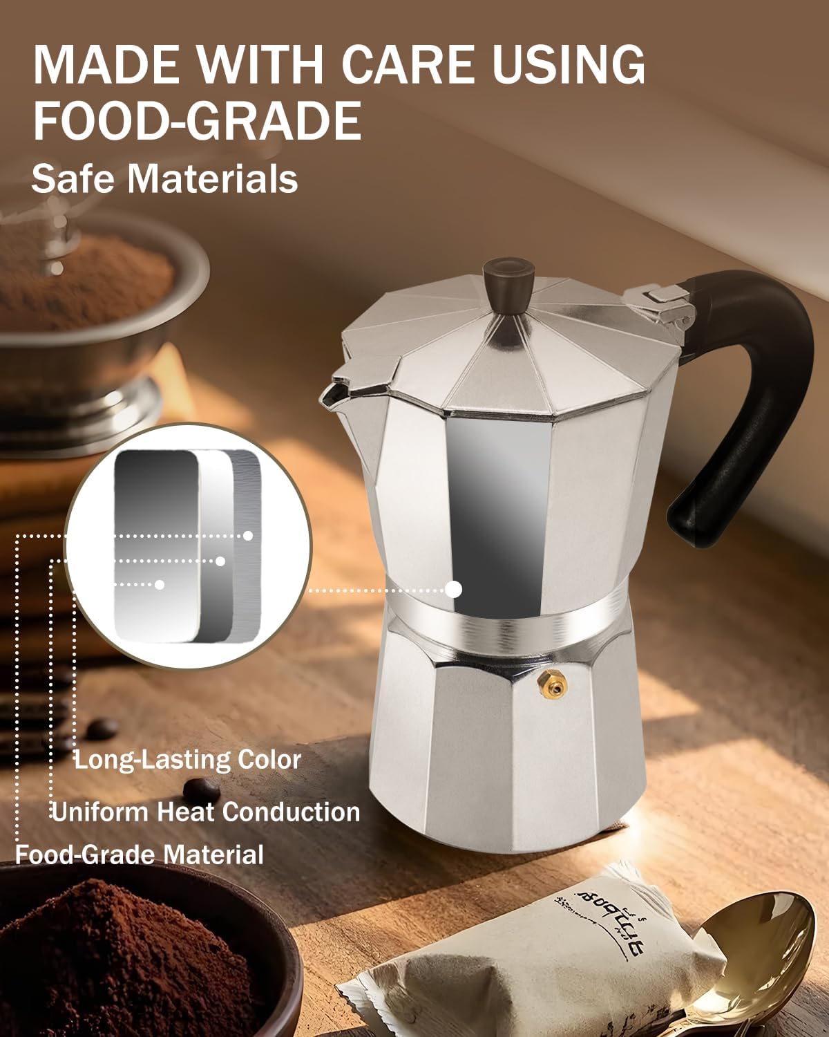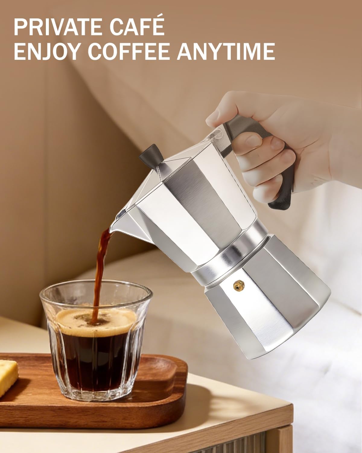 Premium Aluminum:The Moka Pot Aluminum Italian Espresso is crafted from high-quality aluminum, ensuring the heating block distributes heat evenly for a perfect brew every time. Its durable design allows for consistent extraction, delivering rich and flavorful espresso with ease. Experience the authentic Italian espresso taste with this reliable and efficient coffee maker.