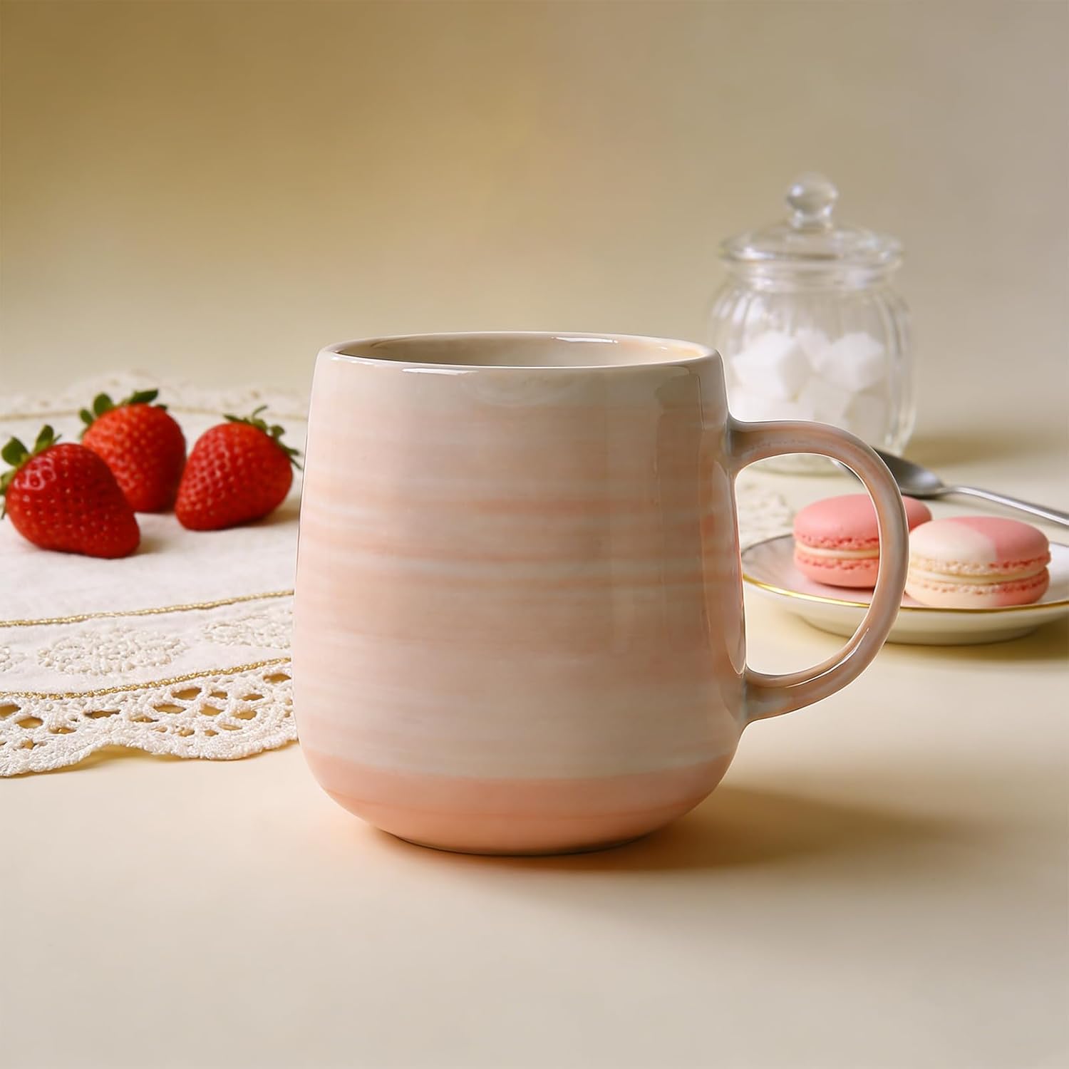 Versatile for Gifting and Personal Use With its soft pink color palette and sophisticated texture, this mug is an excellent choice for a gift or a personal treat. Its photogenic quality and warm, inviting aesthetic make it perfect for creating a cozy moment in any environment.