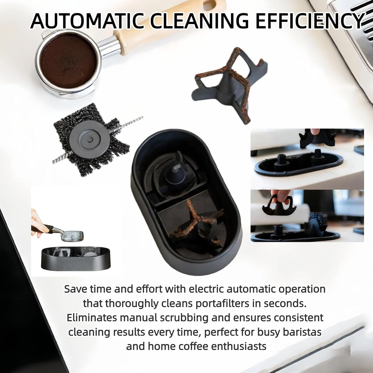 Coffee Portafilter Cleaning Kit, Electric Automatic Knock Box Cleaner, Premium Clean Holder Deep-Clean Brush & Anti-Spill Grounds Tray for 51/53/58mm Machines. (1)