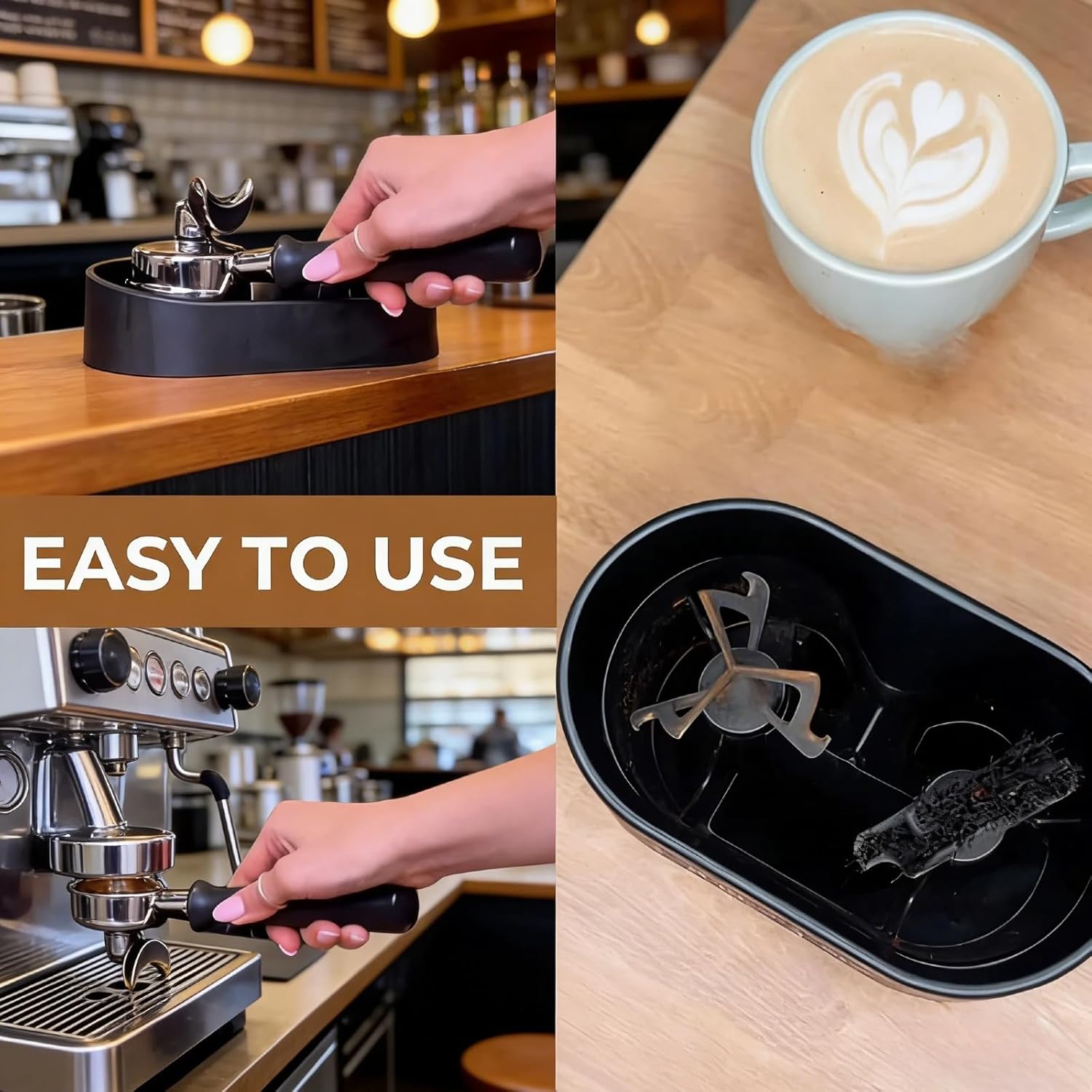 Grounds Catcher: The grooved tray securely holds coffee pucks and grounds, preventing messy spills on your countertop. This Set Enhances Cleanliness.