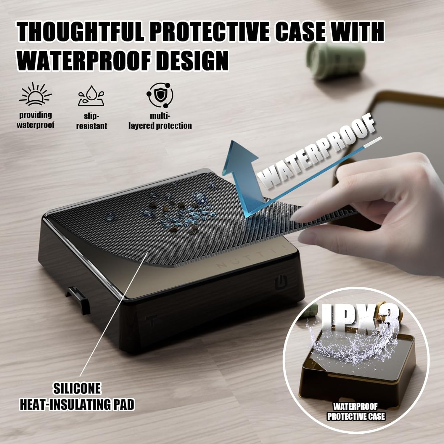 With an IPX3 water-resistant rating and a silicone heatproof, non-slip mat, it’s safe from splashes and coffee drips. Avoid submerging or heavy liquid spills for best care.