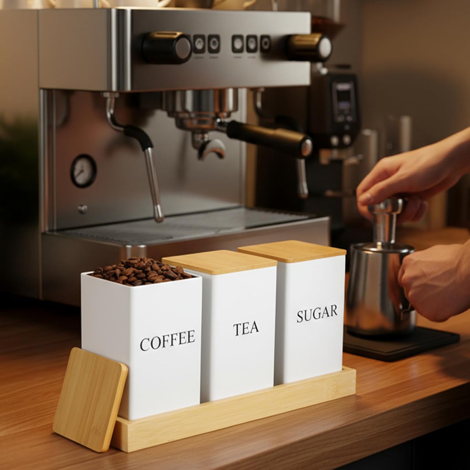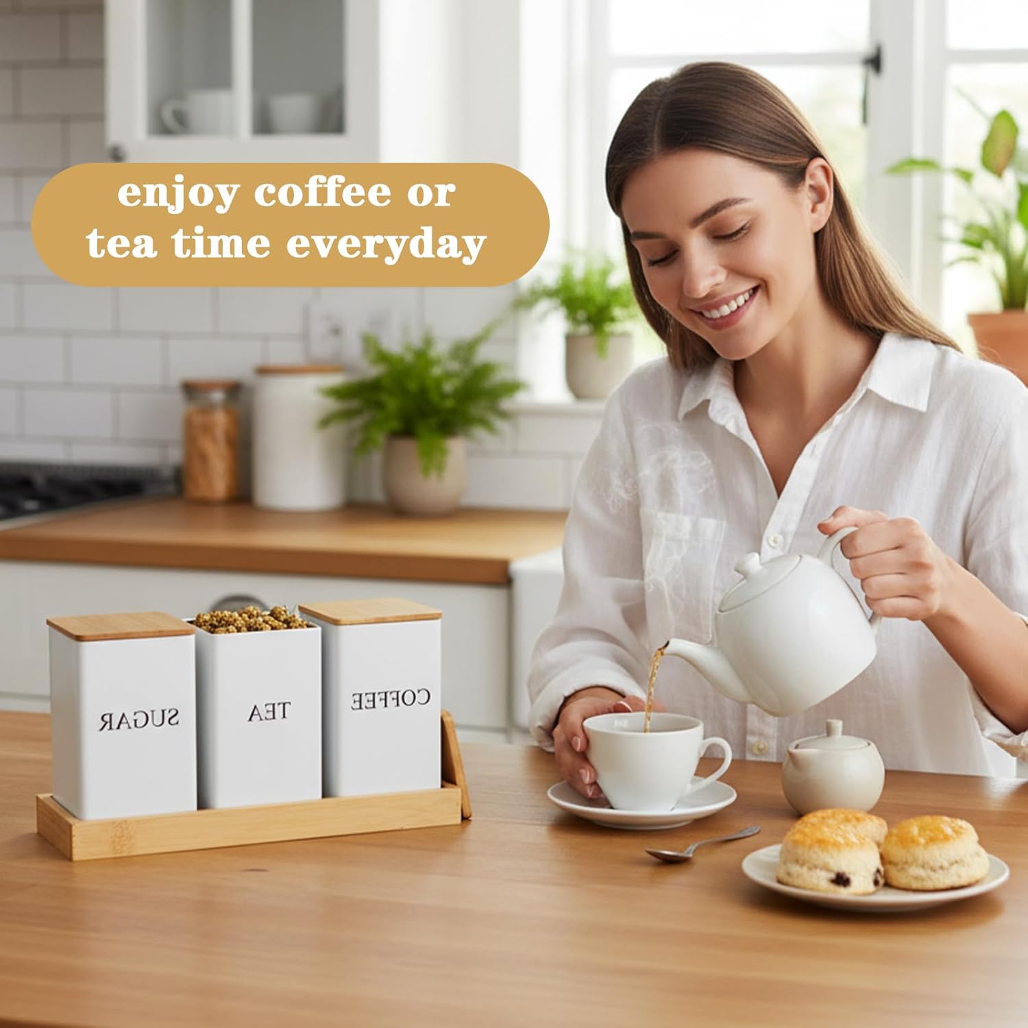 Product Name: Oqqlin Coffee Tea Sugar Container with Tray, Set of 3 Square Airtight Metal Storage Canister with Bamboo Lids White Metal Teas and Coffee Canisters Set