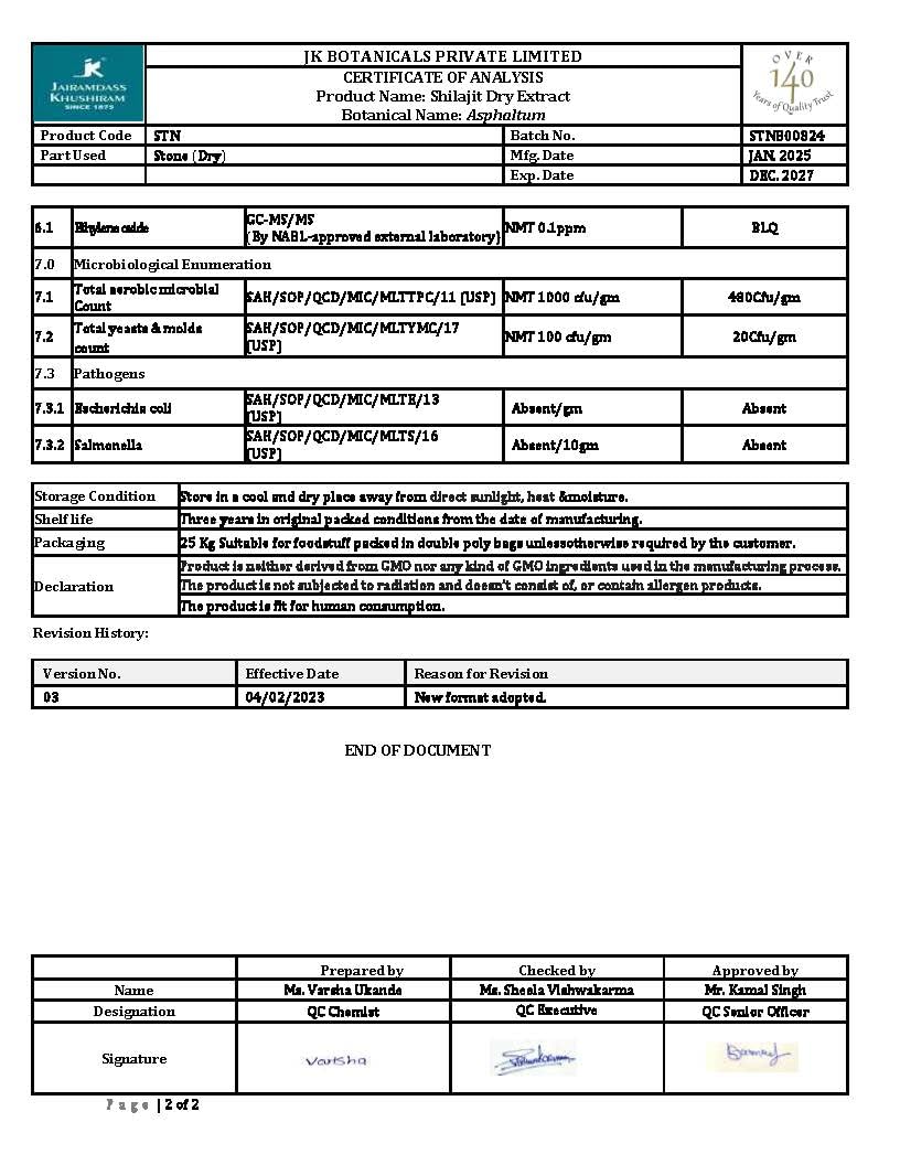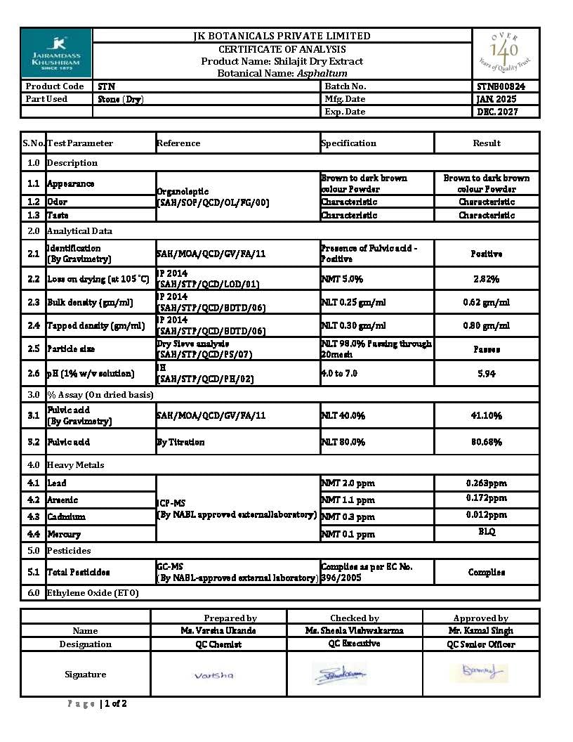 LAB-TESTED FOR YOUR PEACE OF MIND: We are committed to providing only the highest quality shilajit to our customers. To ensure the utmost safety and efficacy of our product, our shilajit has been lab-tested for heavy metals, including lead, arsenic, cadmium, and mercury. This comprehensive testing process guarantees that our shilajit complies with the stringent United States standards for heavy metals, ensuring a product that is not only potent but also safe for consumption.