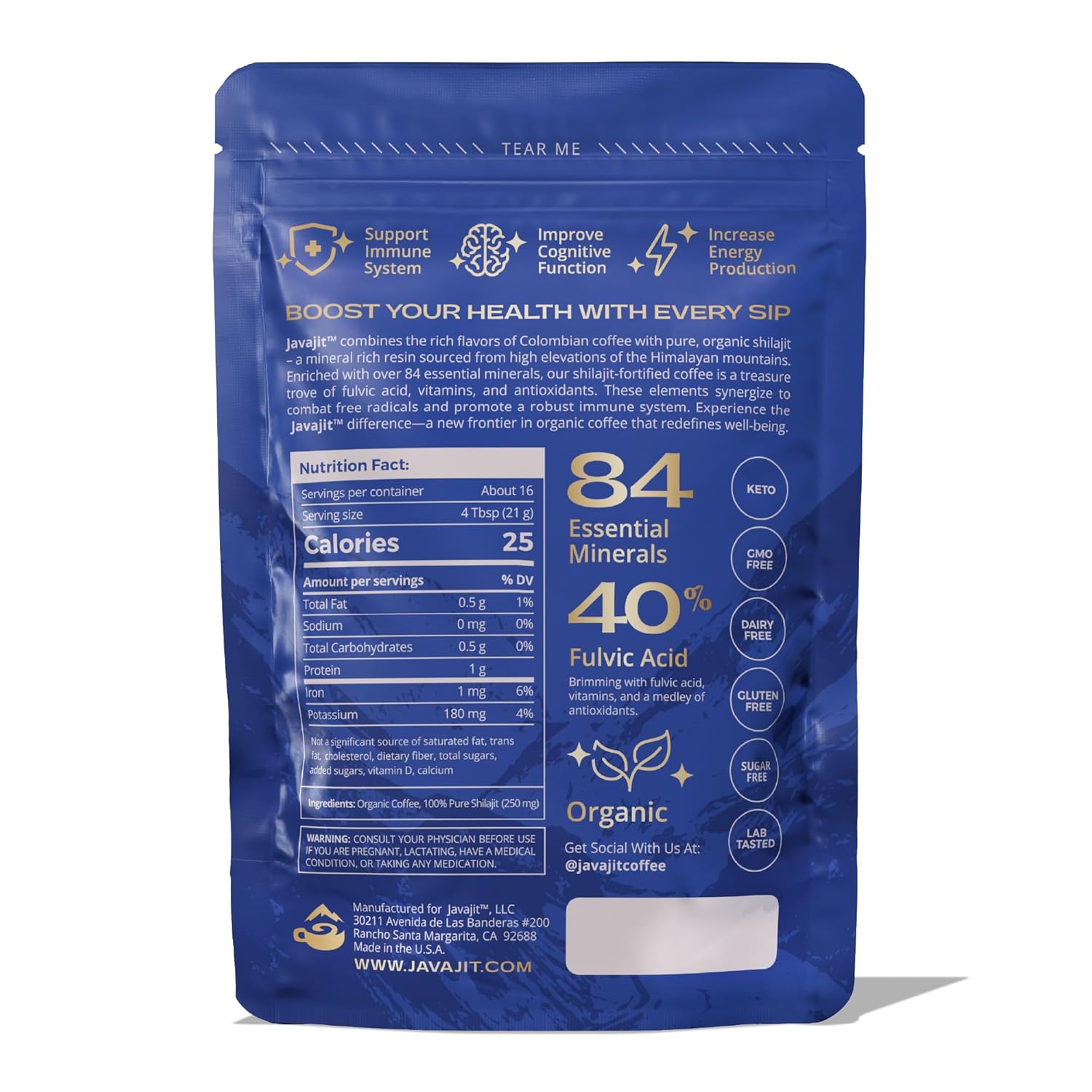 100% PURE SHILAJIT: A natural substance formed over centuries by the gradual decomposition of certain plants, shilajit is a potent and very safe dietary supplement that contains 84+ trace minerals and fulvic acid. There are 250 mg of shilajit per serving of Javajit (4 tbsp).