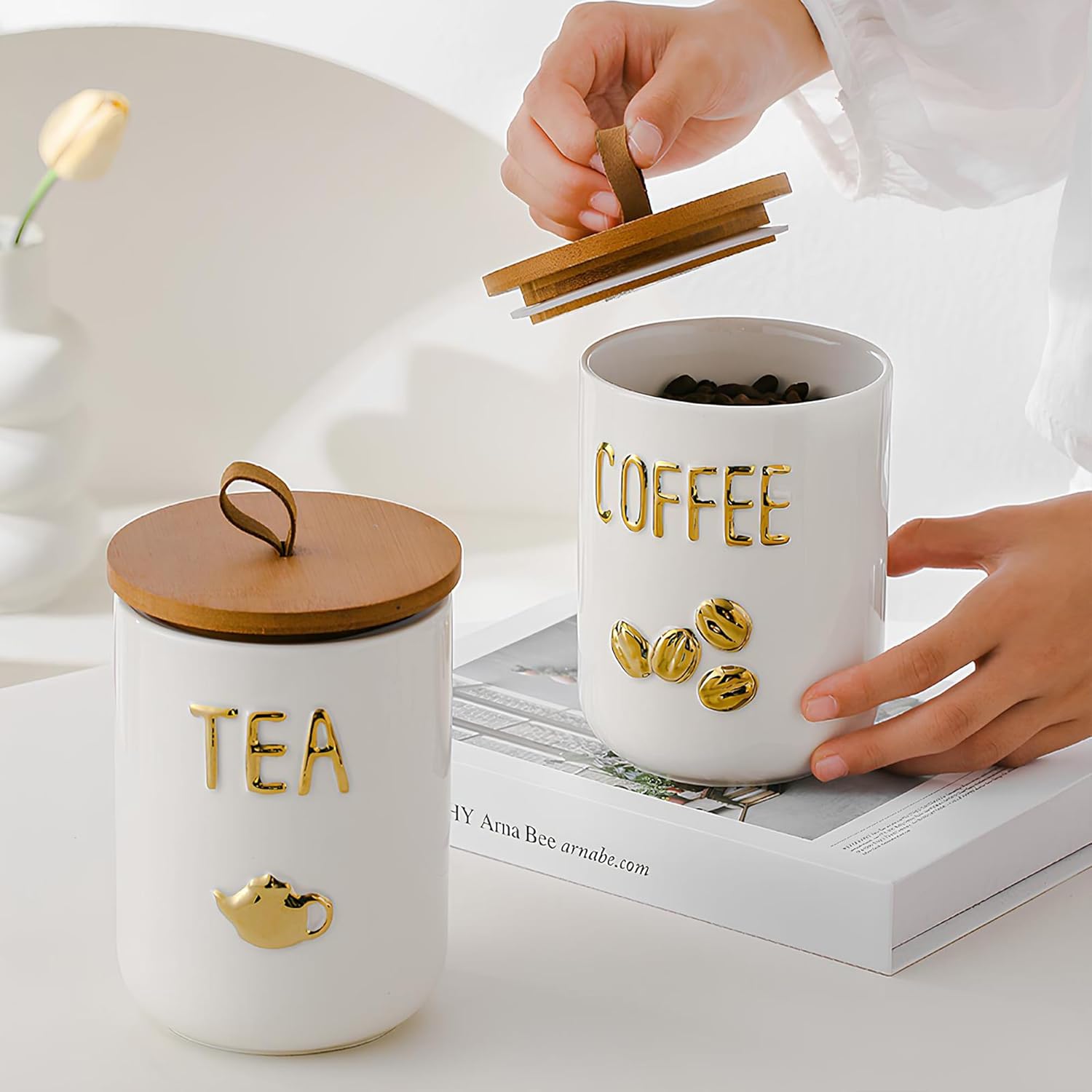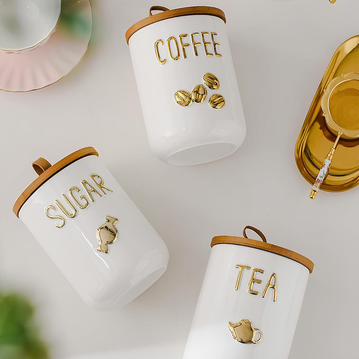 【Stylish Design】Tea sugar coffee container set has a creative embossed gold-plated design, which not only makes categorization easier, but also adds a sense of fun atmosphere to your life and adds a touch of sophistication to your kitchen countertop. Hand-polished wooden lid with strap design, comfortable texture, so you can access more convenient.