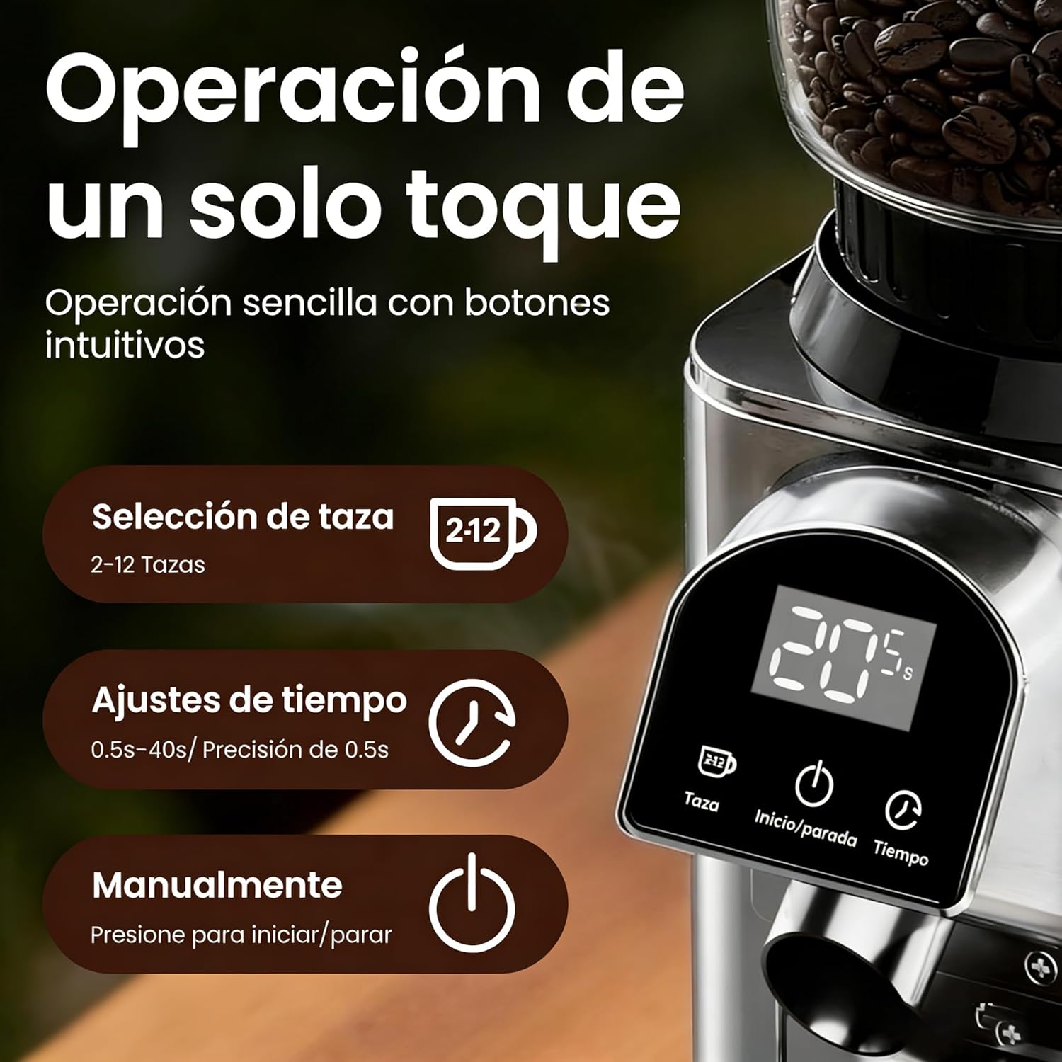 The digital touch panel allows for easy and precise operation. You can grind by time with a precision electronic timer, adjustable in 0.5-second increments.