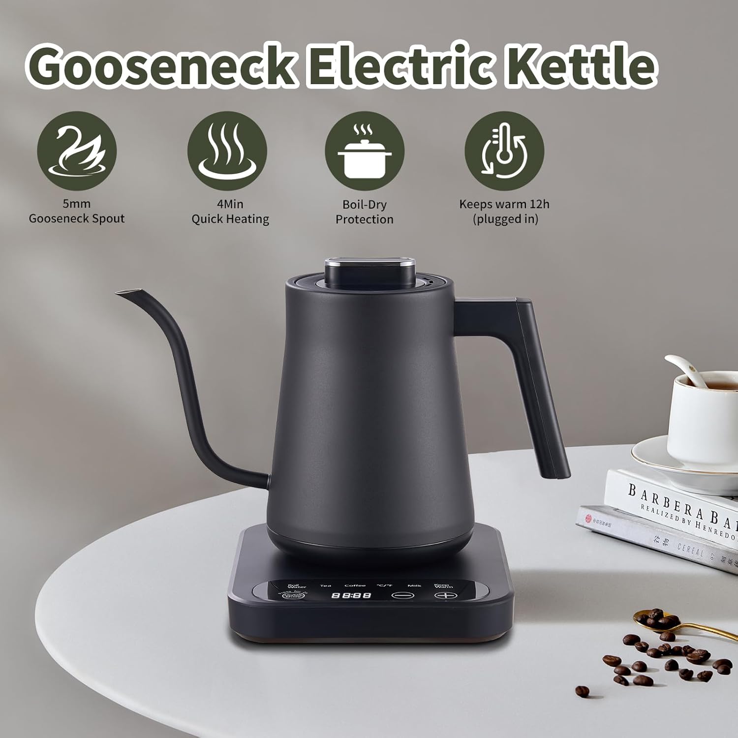 CTT Gooseneck Electric Kettle with Temperature Control, 1L Pour Over Kettle for Coffee/Tea, Hot Water Boiler Kettle Electric, Keep Warm 12 Hours, 316 Stainless Steel Inner, 1000W, Black