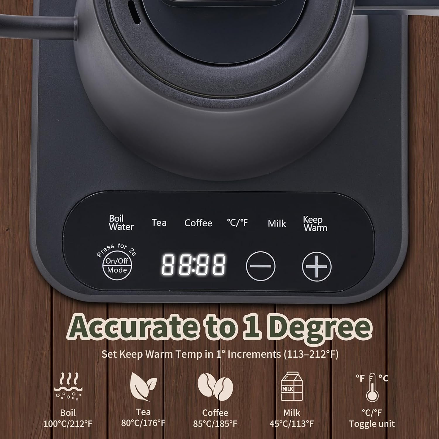 Adjustable Temperature Control – This 110V goose neck kettle pot keeping warm function can set the temperature range within 113℉-212℉ by “+” or “-” buttons, with ±1°F precision. Just gently plug it in, and the black gooseneck kettle can keep warm for up to 12 hours, making it an ideal choice for making coffee, brewing tea or heating milk.