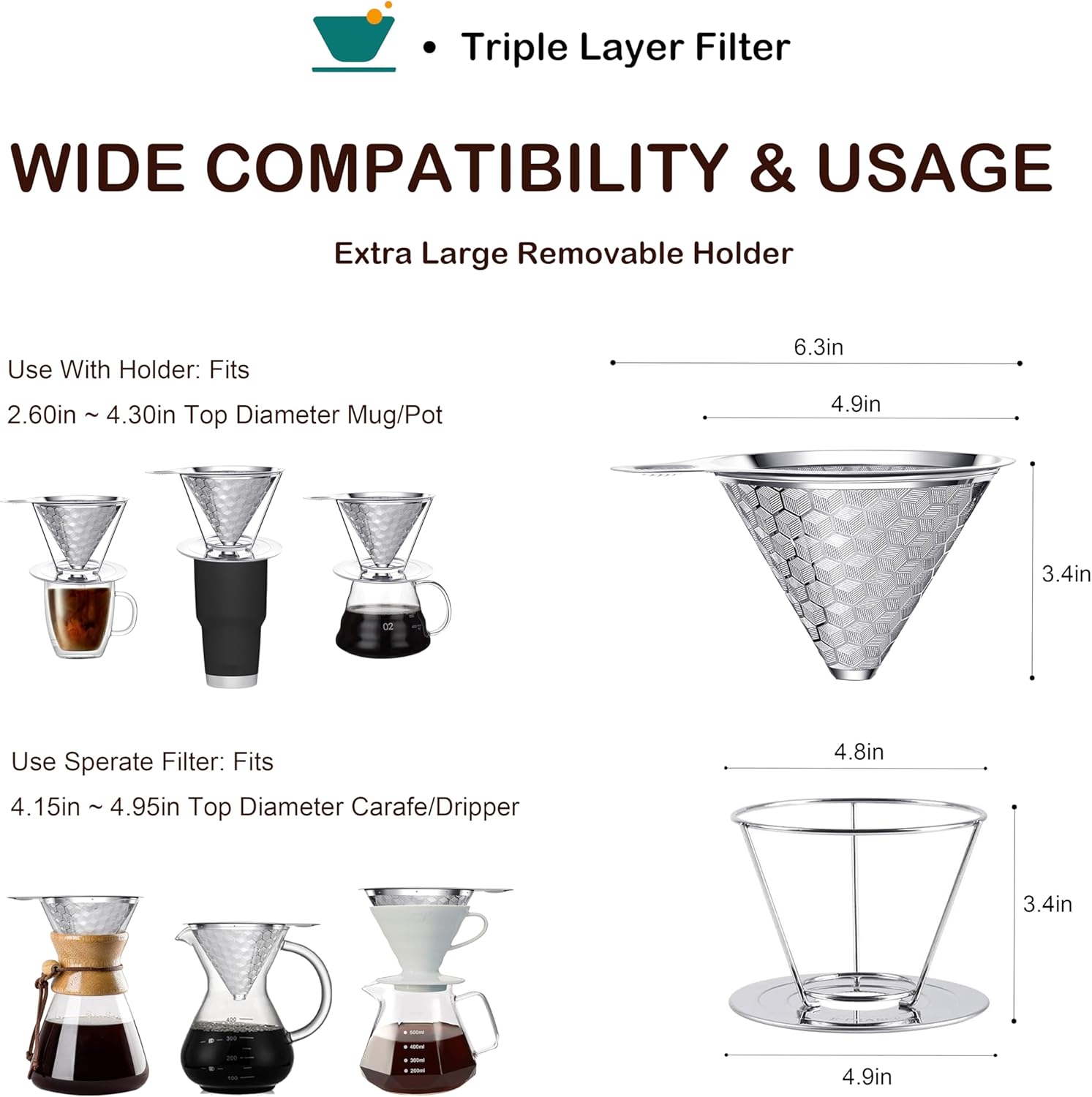 【Premium Material】: Our 3-layer filter is made of high-quality stainless steel, which is durable and will not deform. The filter is permanent and can be used repeatedly, saving money on disposable filters.
